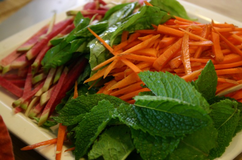 Now for color and texture: vegetables. What do you have around? We had carrot, mint, radish, basil, asparagus and greens.