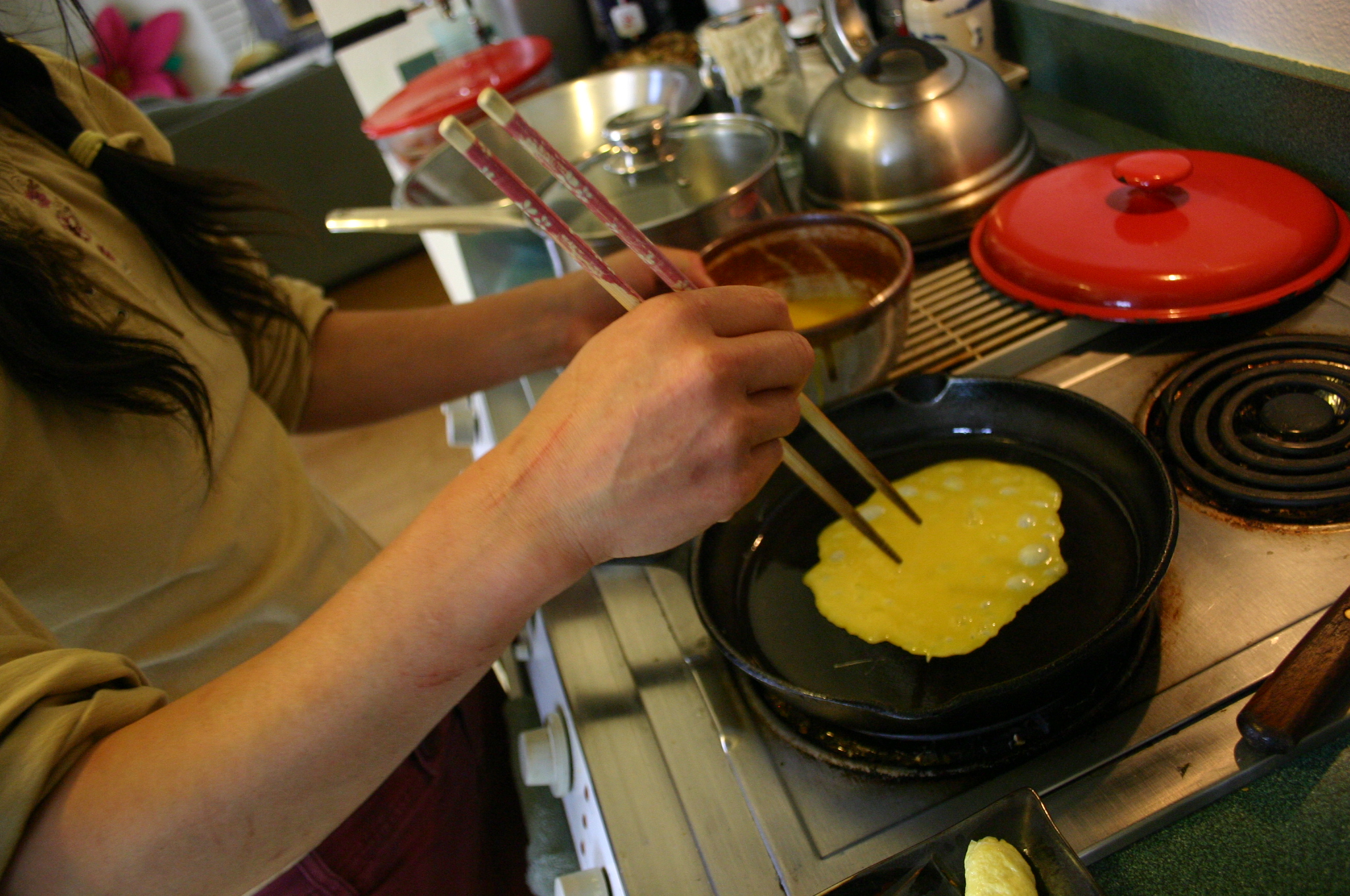 Scramble eggs with water or dashi (broth) in a bowl and pour into a very hot, greased pan (she used virgin coconut oil). Use a pan that can handle eggs, like a well-seasoned cast iron skillet. You’ll need to work quickly. Pour the egg into the pan and tilt to spread evenly.