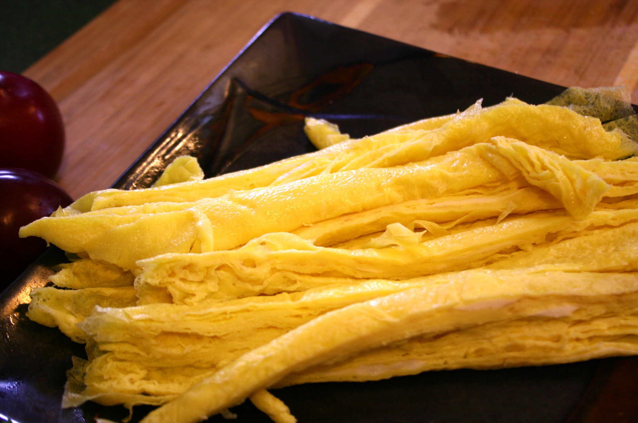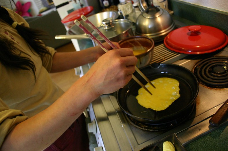 In a few seconds, when the egg is cooked but not browned, pry up the edge with a spatula, chopstick or fork and roll it snug. Leave the rolled egg in the pan, along the back edge, and pour another round of egg in the remainder of the pan. The second crepe will adhere to the first as it cooks. When this one is finished, take the first and roll it back over the second to make one large roll. Remove, cool slightly and slice into long strips.