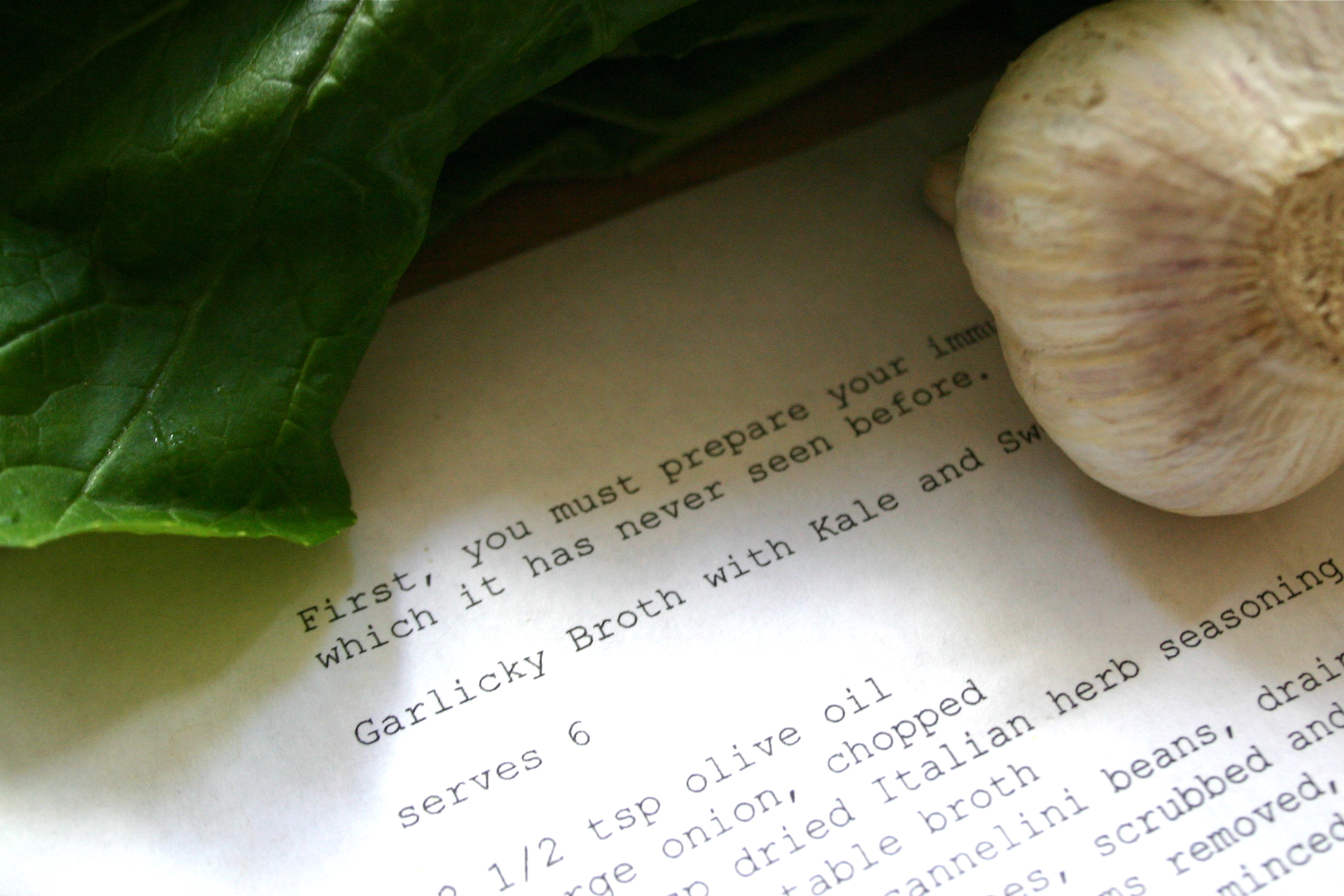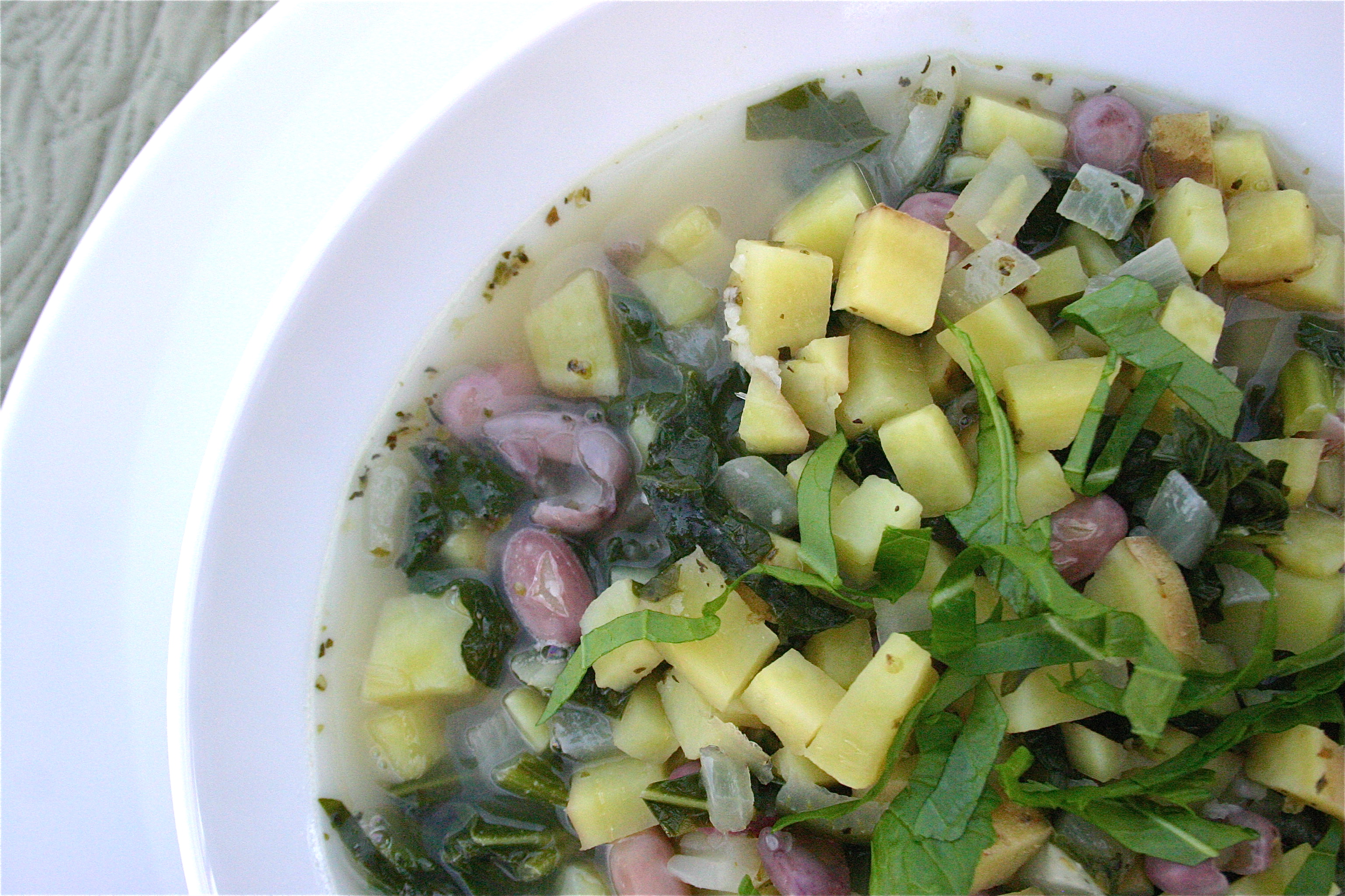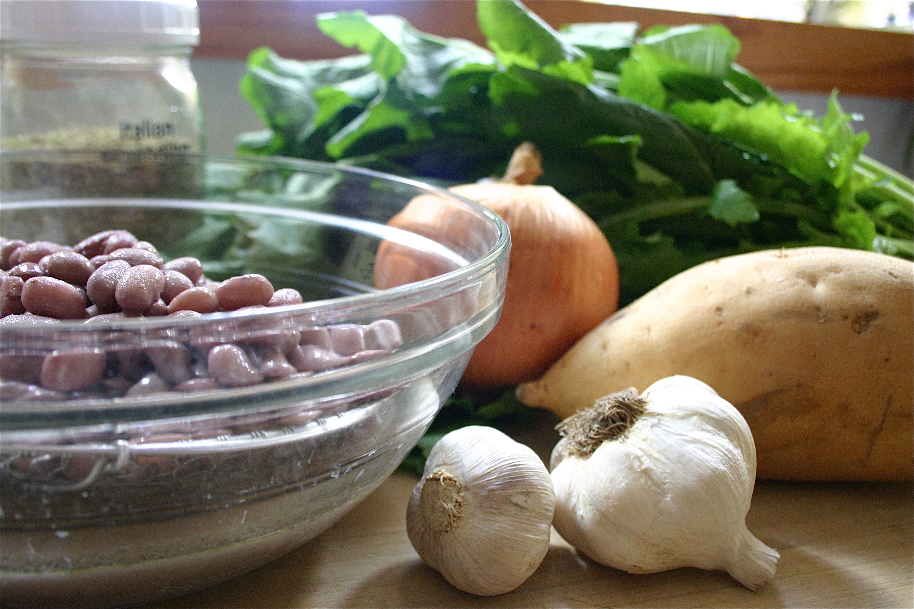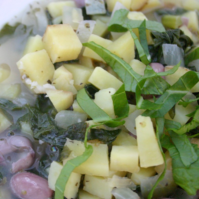 For this batch I shelled and cooked fresh cranberry beans and substituted broccoli raab for the kale. I also used the reserved cooking liquid for the broth and made up the difference with water.