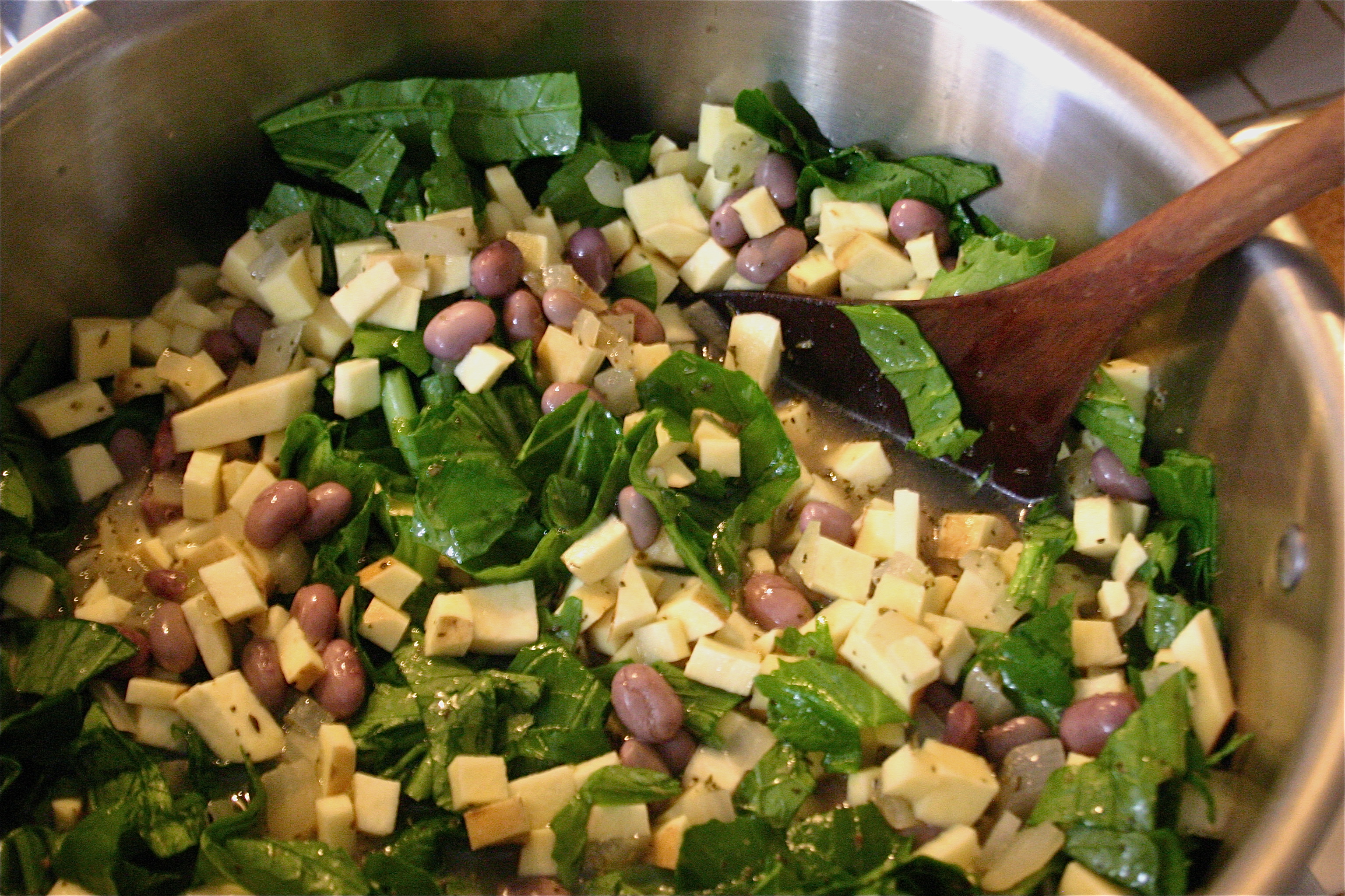 Stir in broth, beans, potatoes and kale.