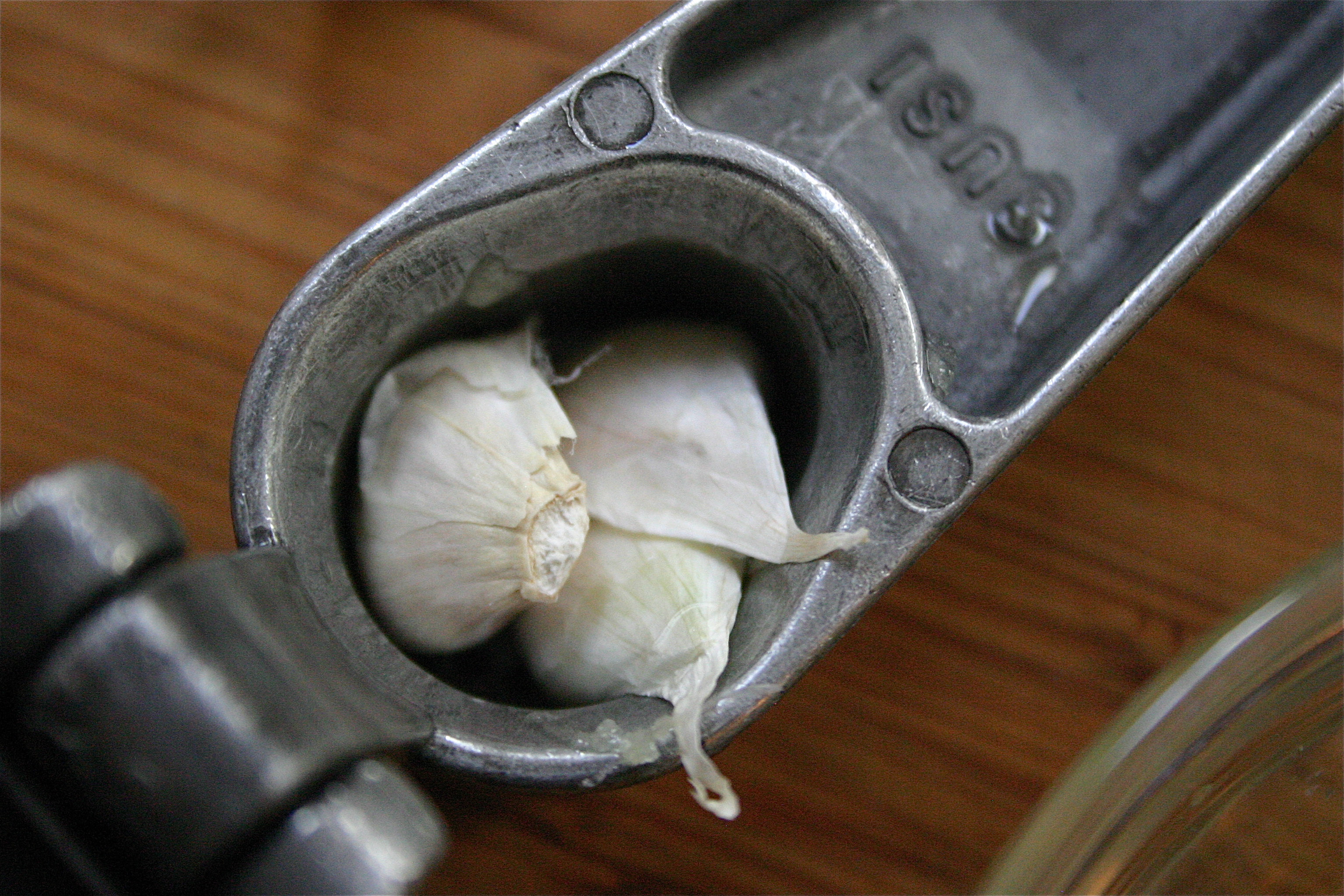Add garlic to simmering soup base.