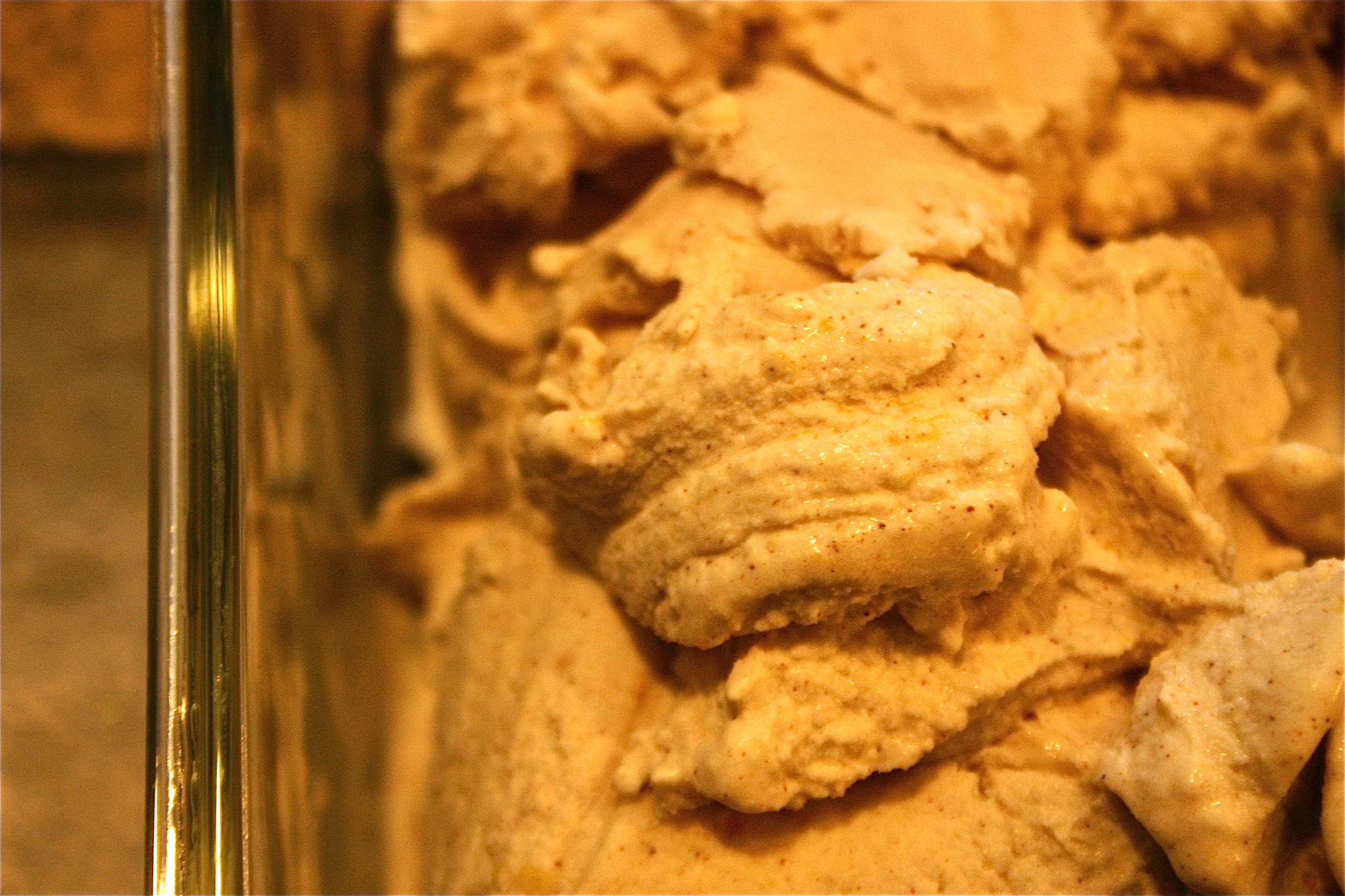 I make a similar ice cream. I add some additional ingredients to my pumpkin ice cream. Silken smooth coconut meat puree (not fully mature coconut meat), and coconut water to the mixture. I add chopped pecans or walnuts as a topping. The nutty taste add more flavor to the coconut/pumpkin flavor of the ice cream. Try it. If you like coconuts, you would like it. If you cannot get the young coconut meat, it is sometimes hard to find, you can try using nata de coco. You can purchase the nata de coco from Thai/Philipino/Asian foods stores.