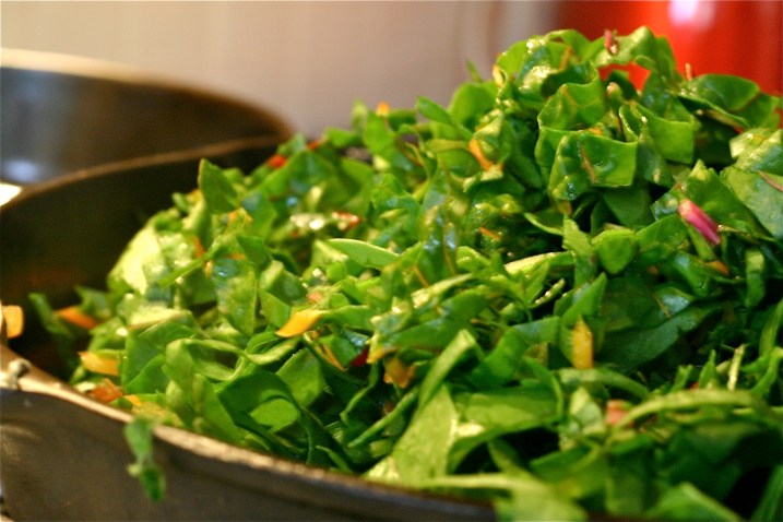 Cook until heated. Add the sliced chard leaves, cooking until tender but bright green.