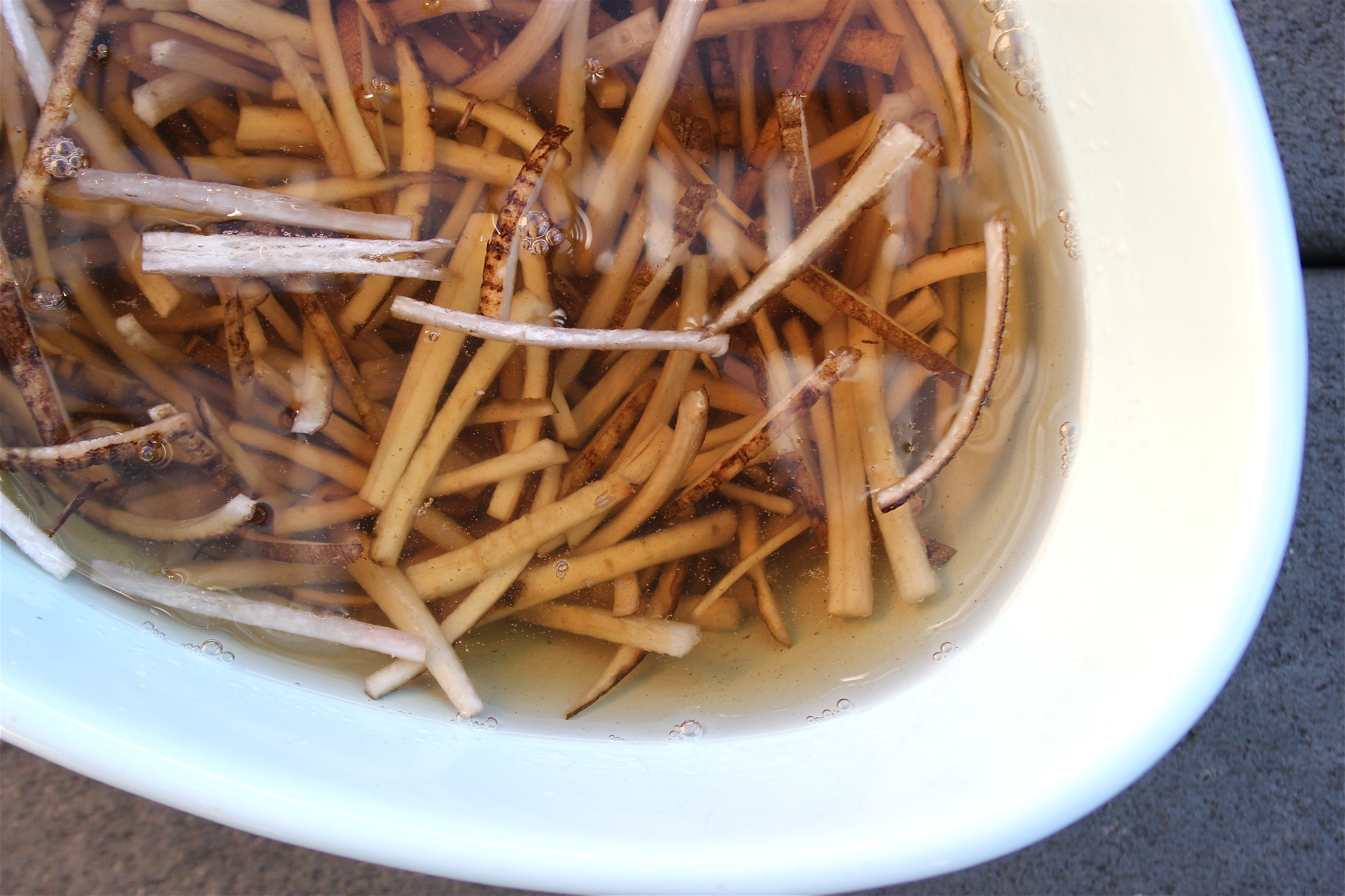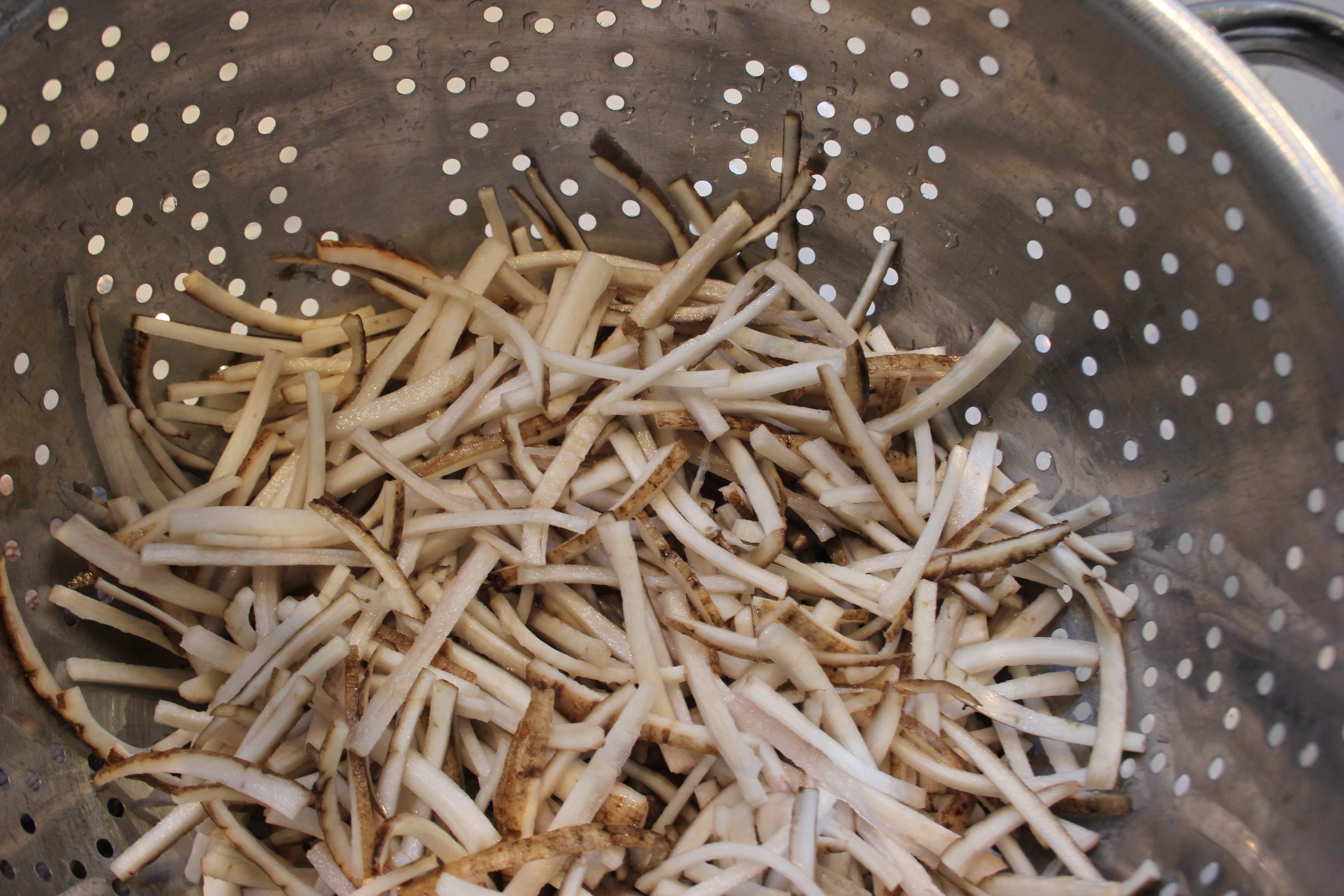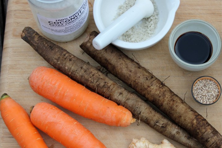 Scrub the Burdock root and carrots clean. Julienne the burdock and soak in a medium