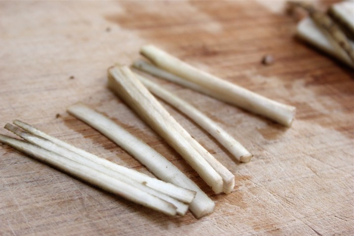 Now I’ll take you back to 10:30 yesterday morning. I’m standing over a cutting board, gripping (now properly) one of our chef’s knives. I’ve just cut the burdock root into one-and-a-half-inch chunks (julienne = one-eighth by one-eighth by one-and-a-half!) and am laying them on the board, one by one, where I carefully slice and stack and slice again.