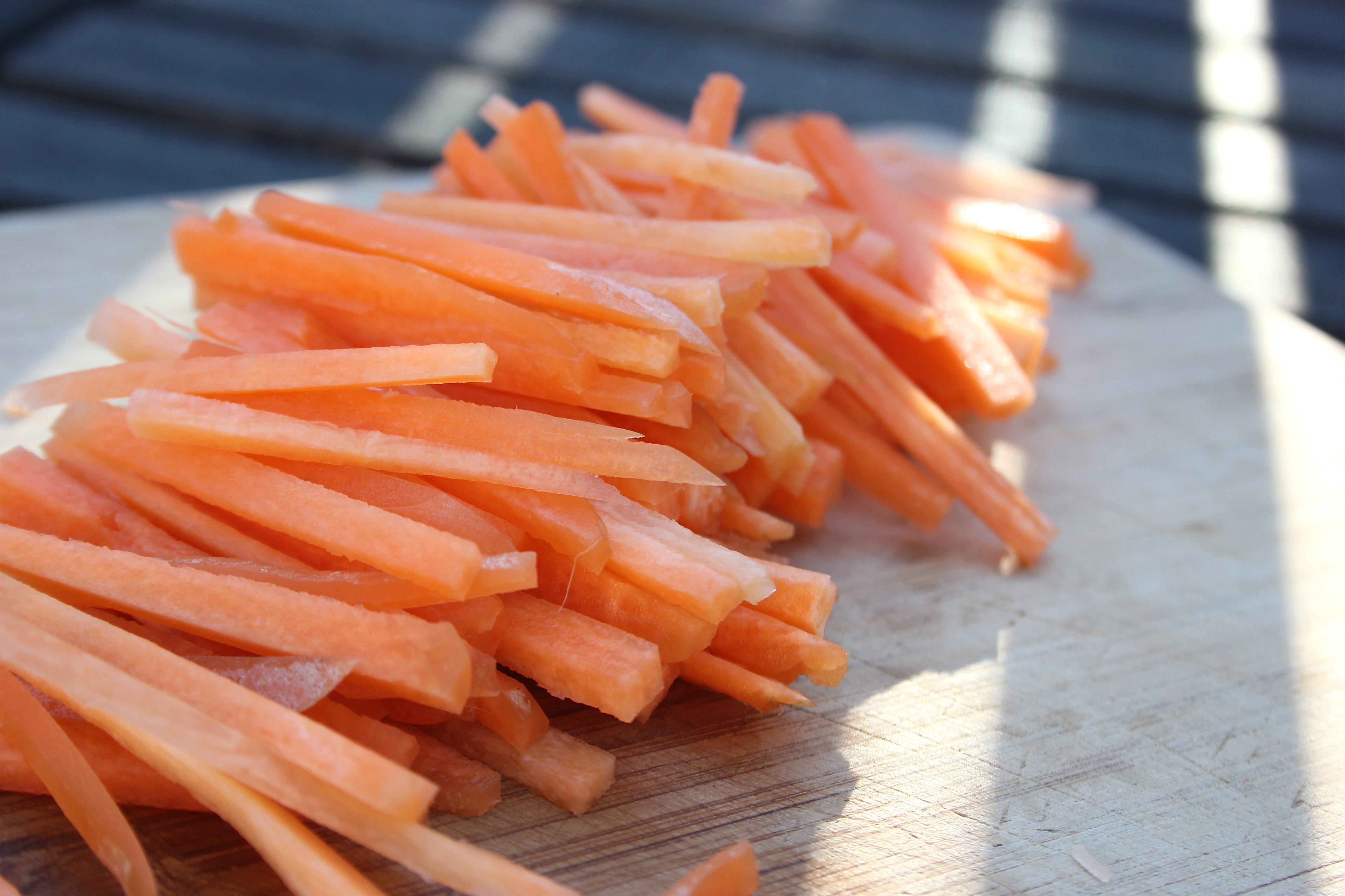 bowl full of water to prevent from discoloration until ready to cook. Julienne the carrots.