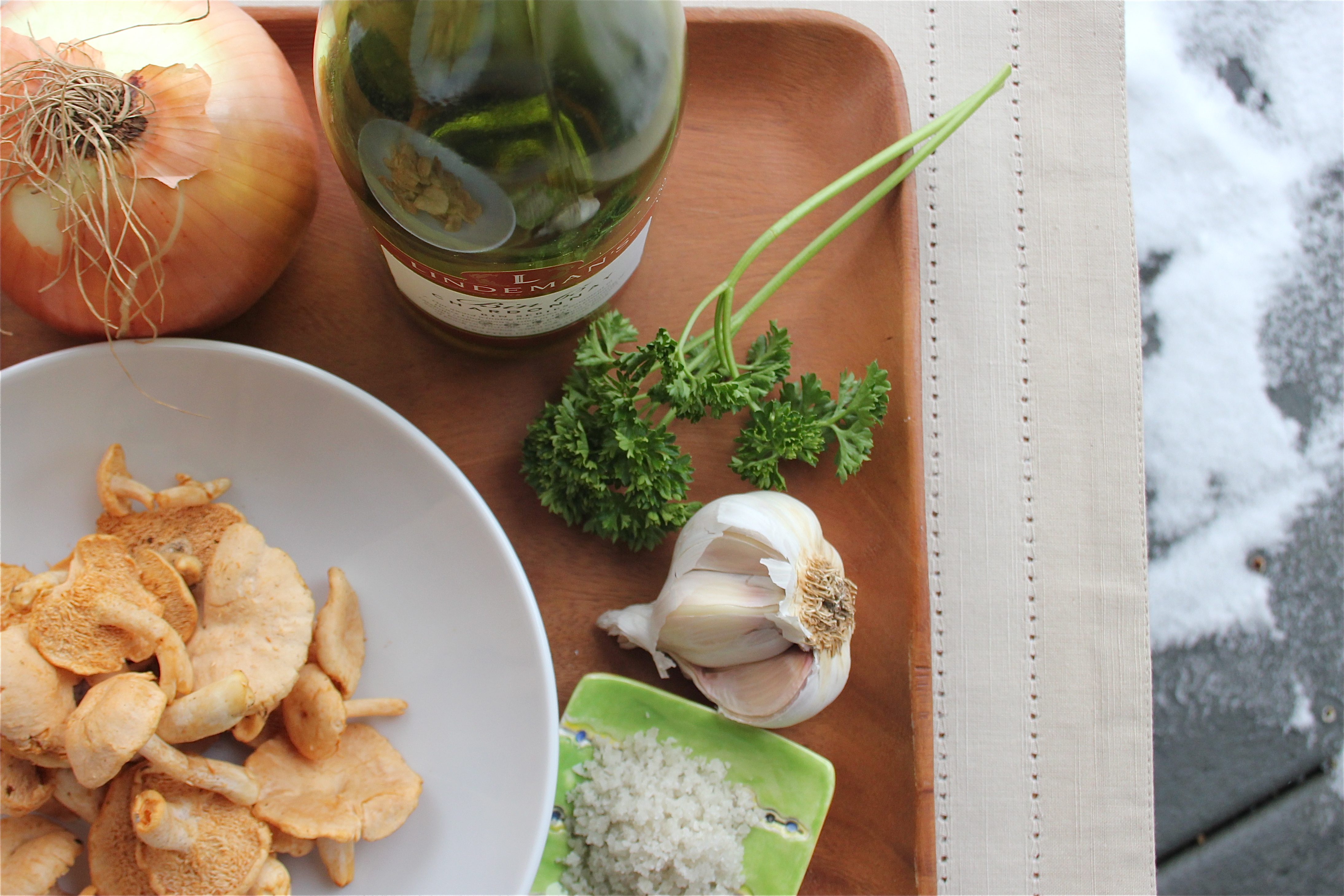 Even without all the fixings, these regional mushrooms made for a wonderful lunch. Also known as Sweet Tooth, these mushrooms are dubbed Hedgehog for the spiny protrusions that cover their underbellies like shag carpeting. They’re firm, like Chanterelles, and pretty in the pan since they keep their shape. And oh-so-good with garlic, a bit of humble onion and a splash of white wine. Heaven.