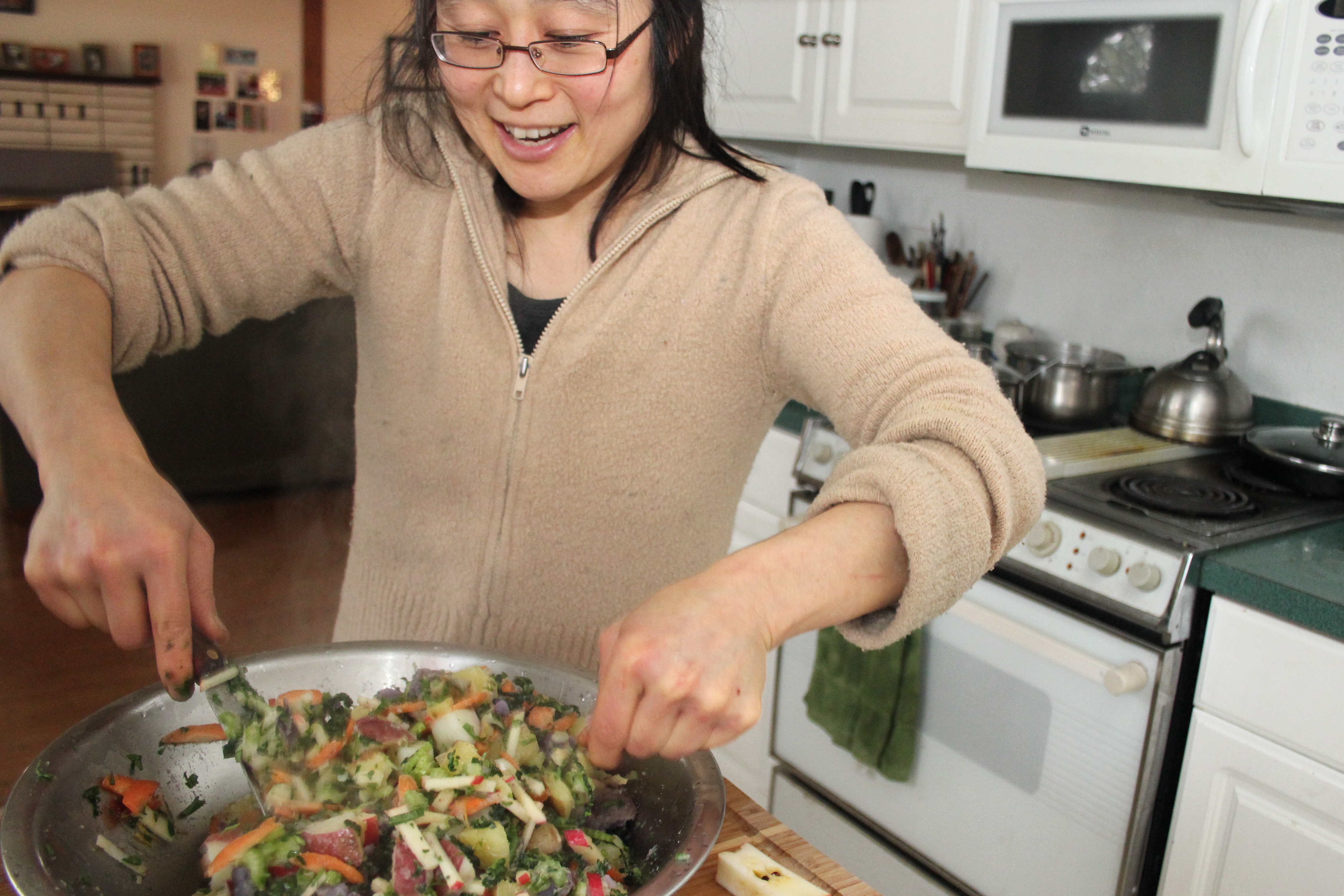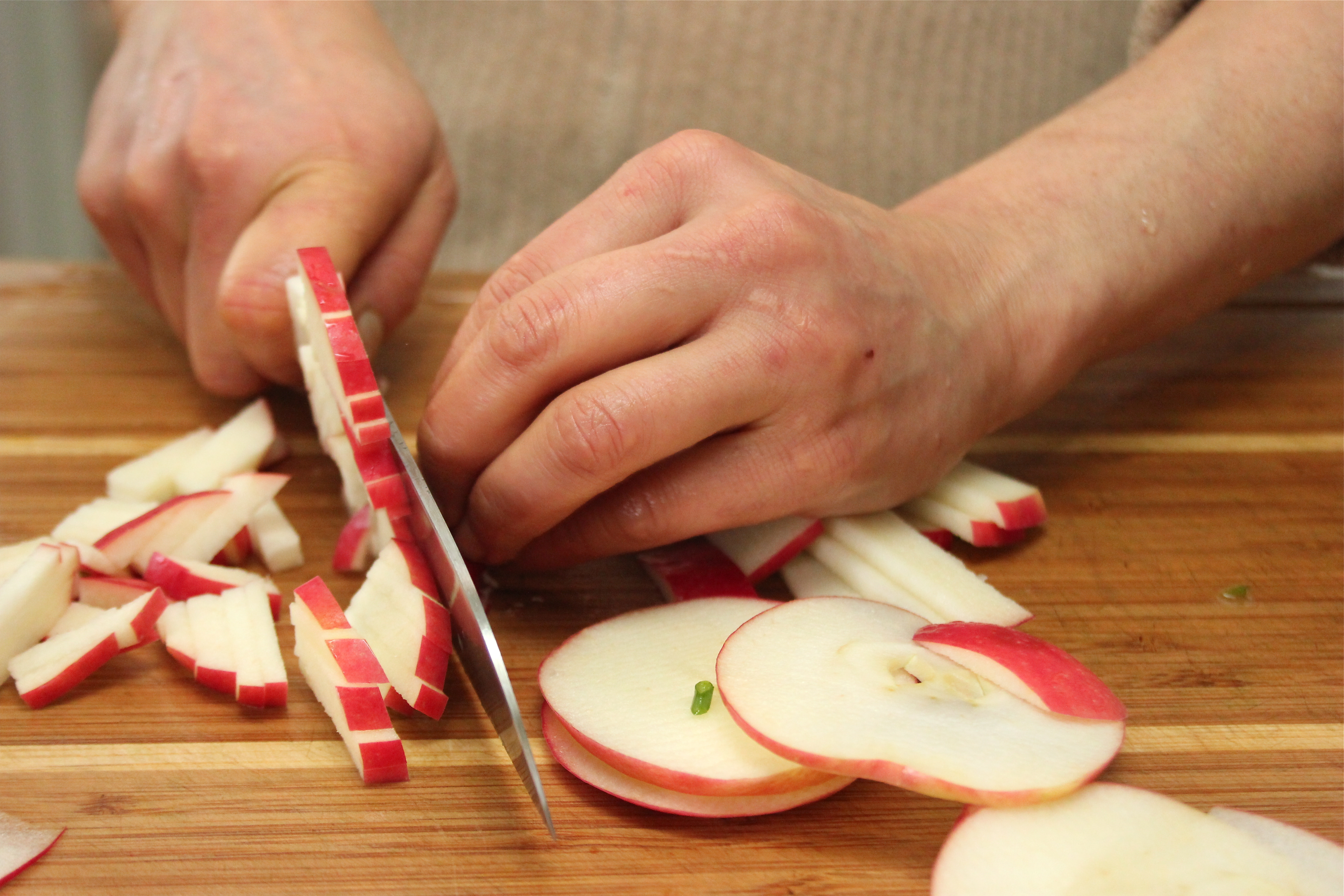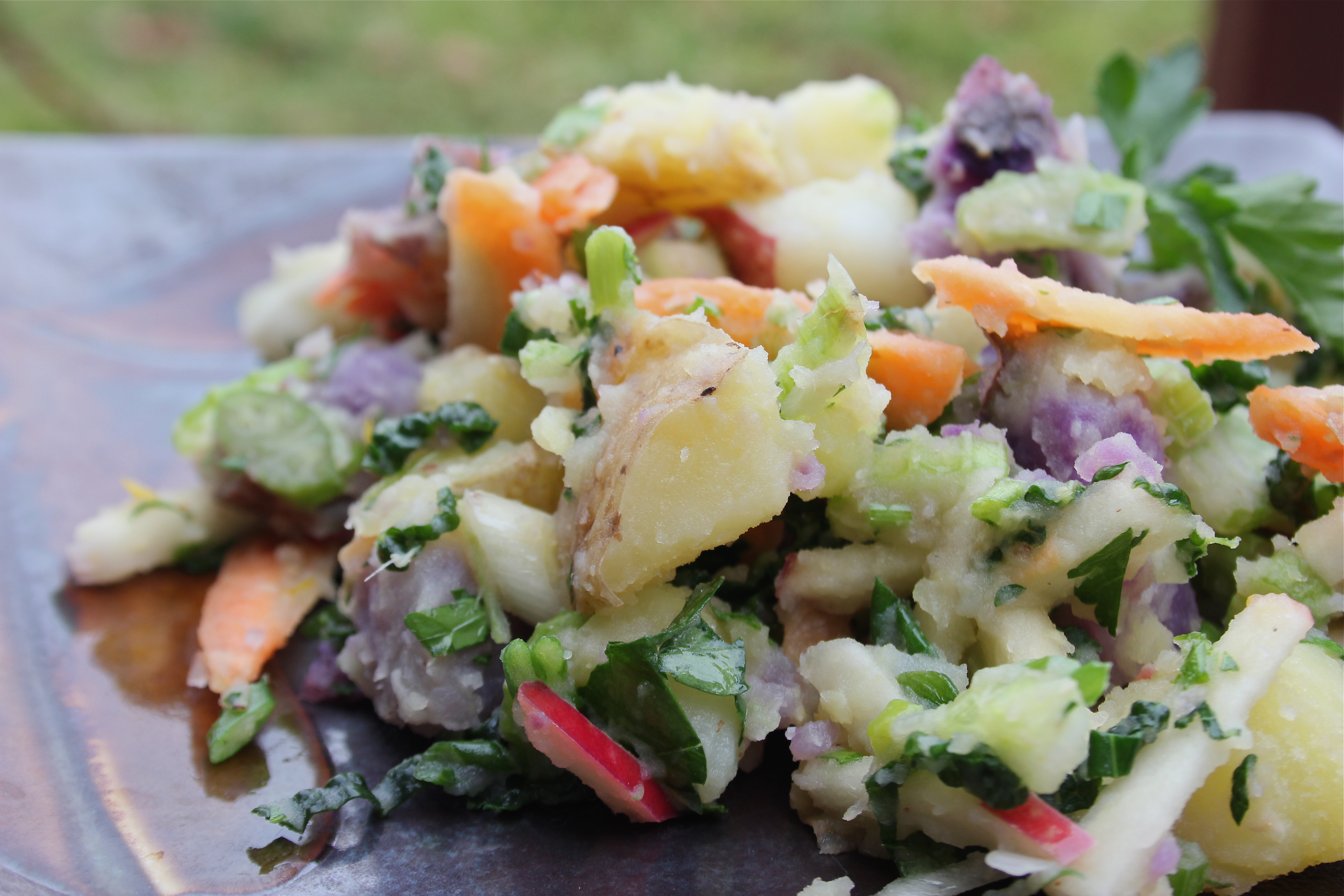 This week Chie and I got together to cook, something we’re hoping to do more often, and it was fun and healing to talk and laugh and chop together, tasting as we went. She came up with this warm potato salad held together by a vinegar dressing. Which, in my current state of mind, is something more than coincidental. The sourness of the apple cider vinegar (something you couldn’t happily consume straight from, say, a shot glass) is mixed with oil and mustard, blending boiled potatoes and chopped vegetables into something more.