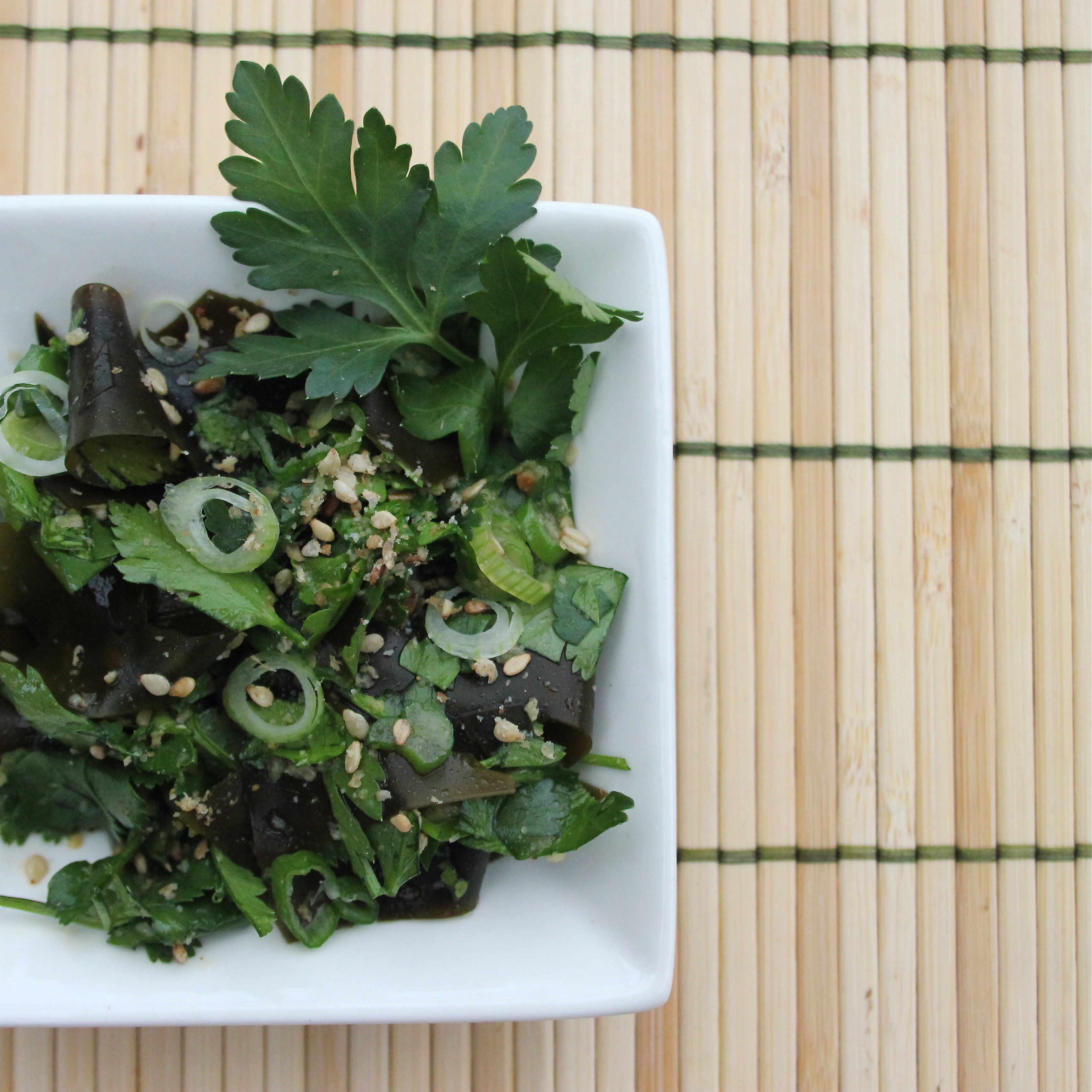Wakame is native to the California coast and that’s where the seaweed I used in today’s recipe came from. (I wrote about the company that harvests it once. You can go here and scroll down to the sea veggies article to find out a bit about the mindful, hardworking folks at Rising Tide Sea Vegetables.)
