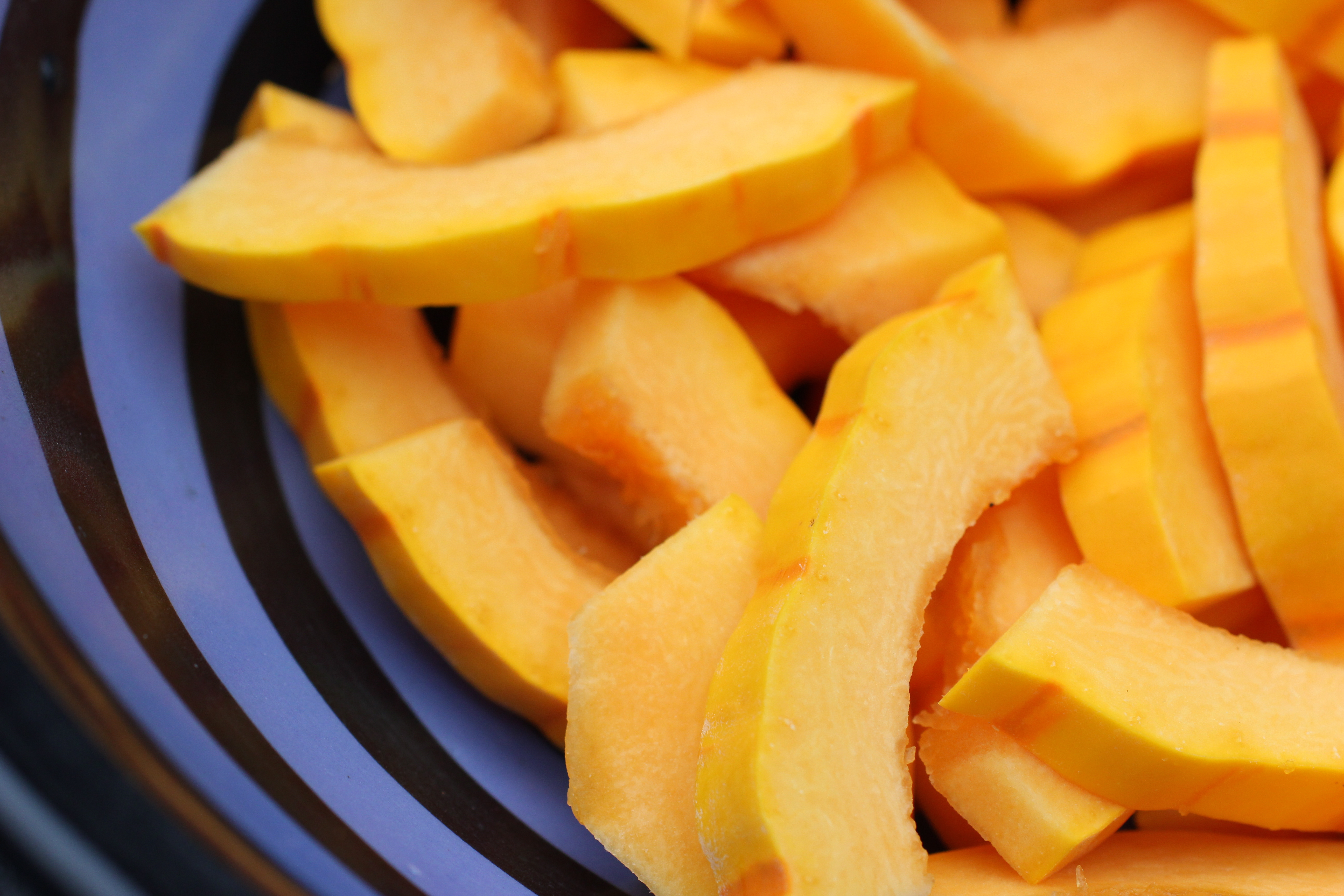 While the shellfish are steaming, slice the baguette and set aside. Sauté the delicata in one tablespoon of olive oil until al dente. Add the baby bok choy and cook for several minutes, until they turn bright green. Add a splash of water and cover to steam them along until the squash is cooked to your liking.