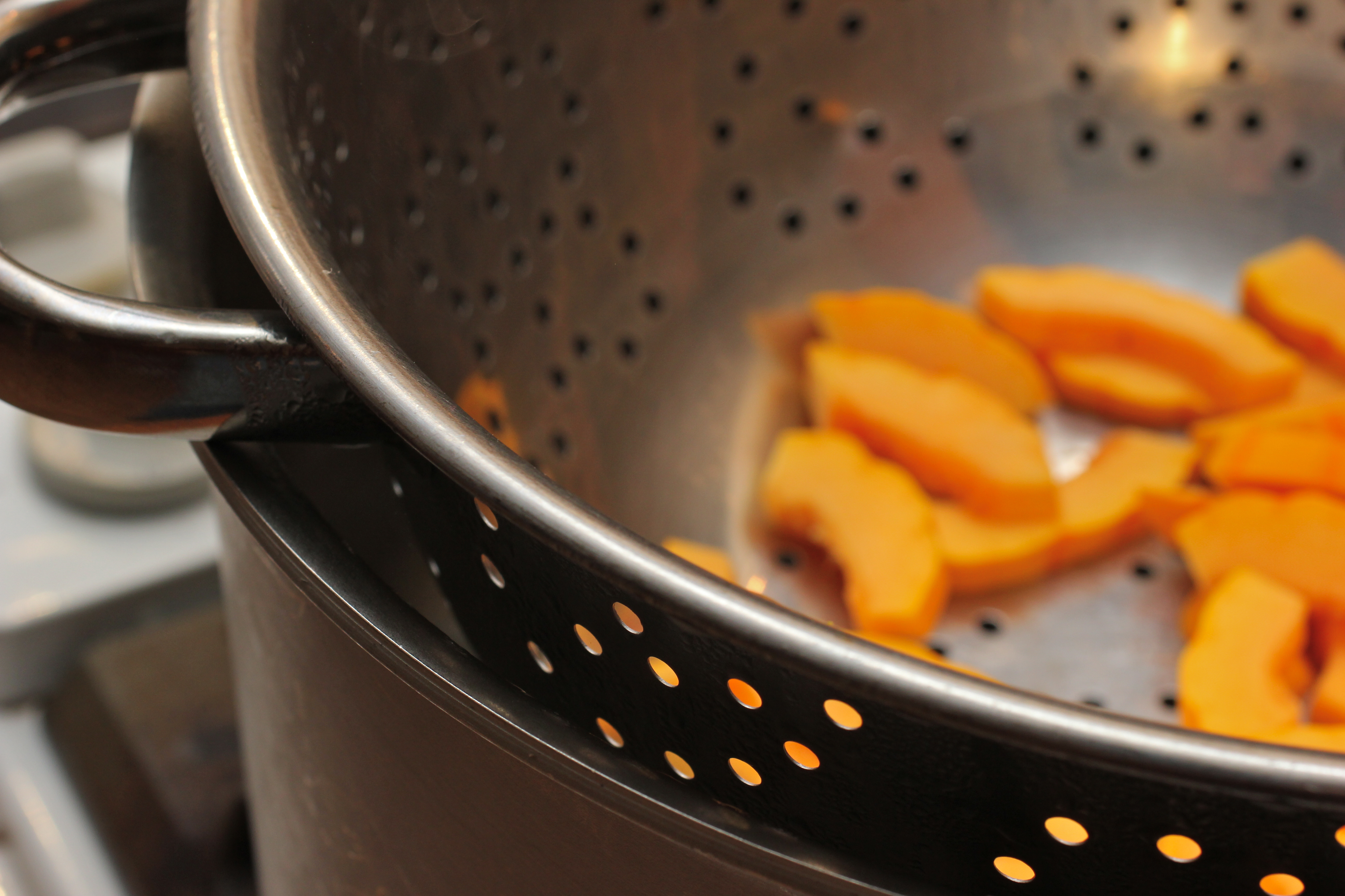 Here’s where it went wrong, I think: Tony must have a closed steaming system. Since I don’t (I used a colander atop a soup pot, which left a sizable gap around the rim) my wine boiled away in no time and though the squash weren’t enveloped in smoke, the bottom of the pan was black.
