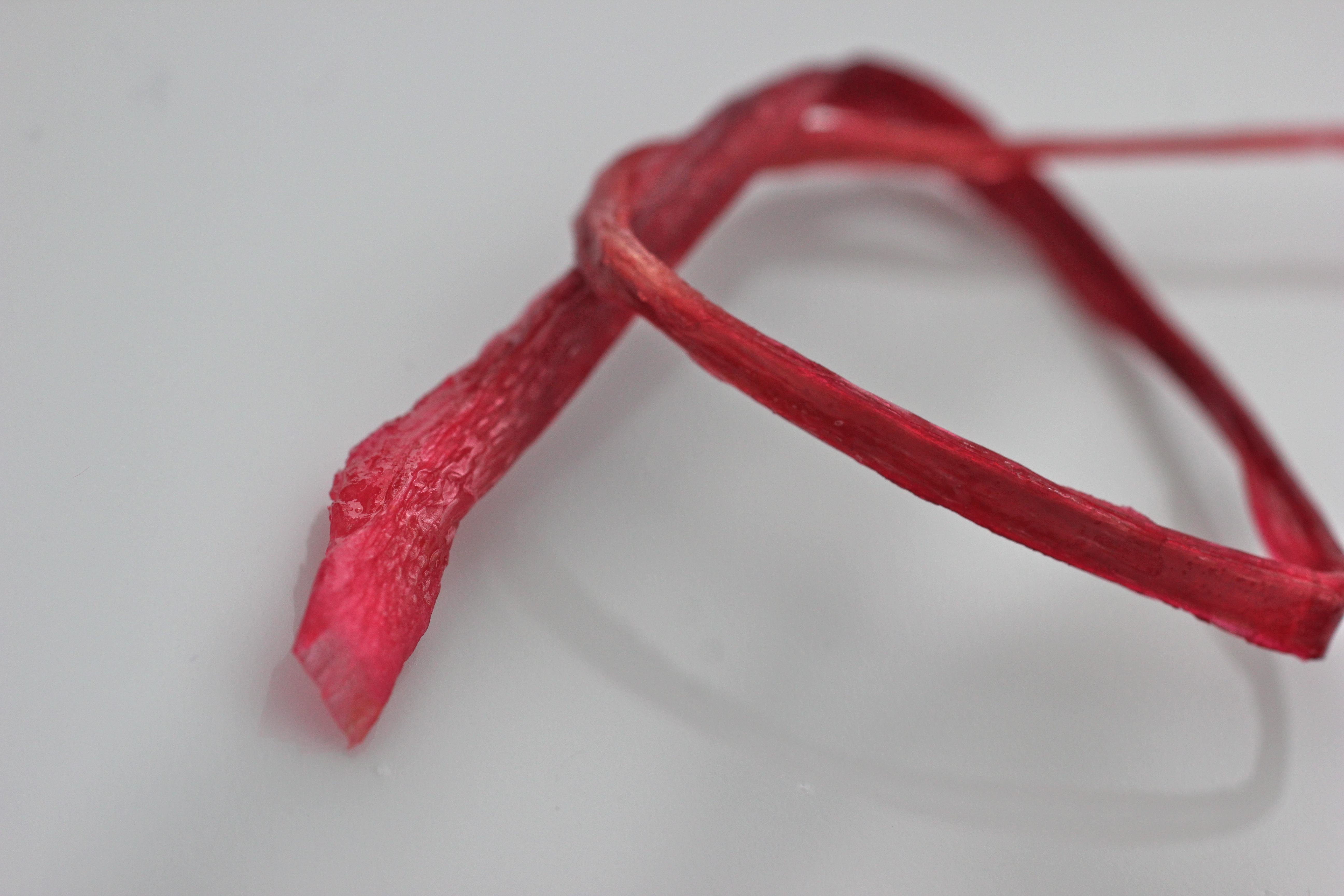 To candy the rhubarb, I followed this recipe, heating sugar and water in a pan, slicing the rhubarb into ribbons, briefly soaking and laying them flat to dry in a warm oven.