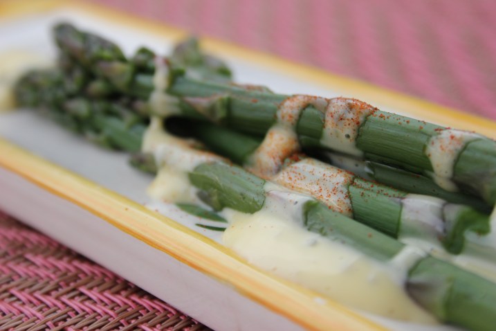 So for today we’re going with something simple. Steam some trimmed asparagus spears. Top with hollandaise sauce (Chie referred me to this recipe, which worked beautifully). Dust paprika on top and enjoy before the season runs out in June.