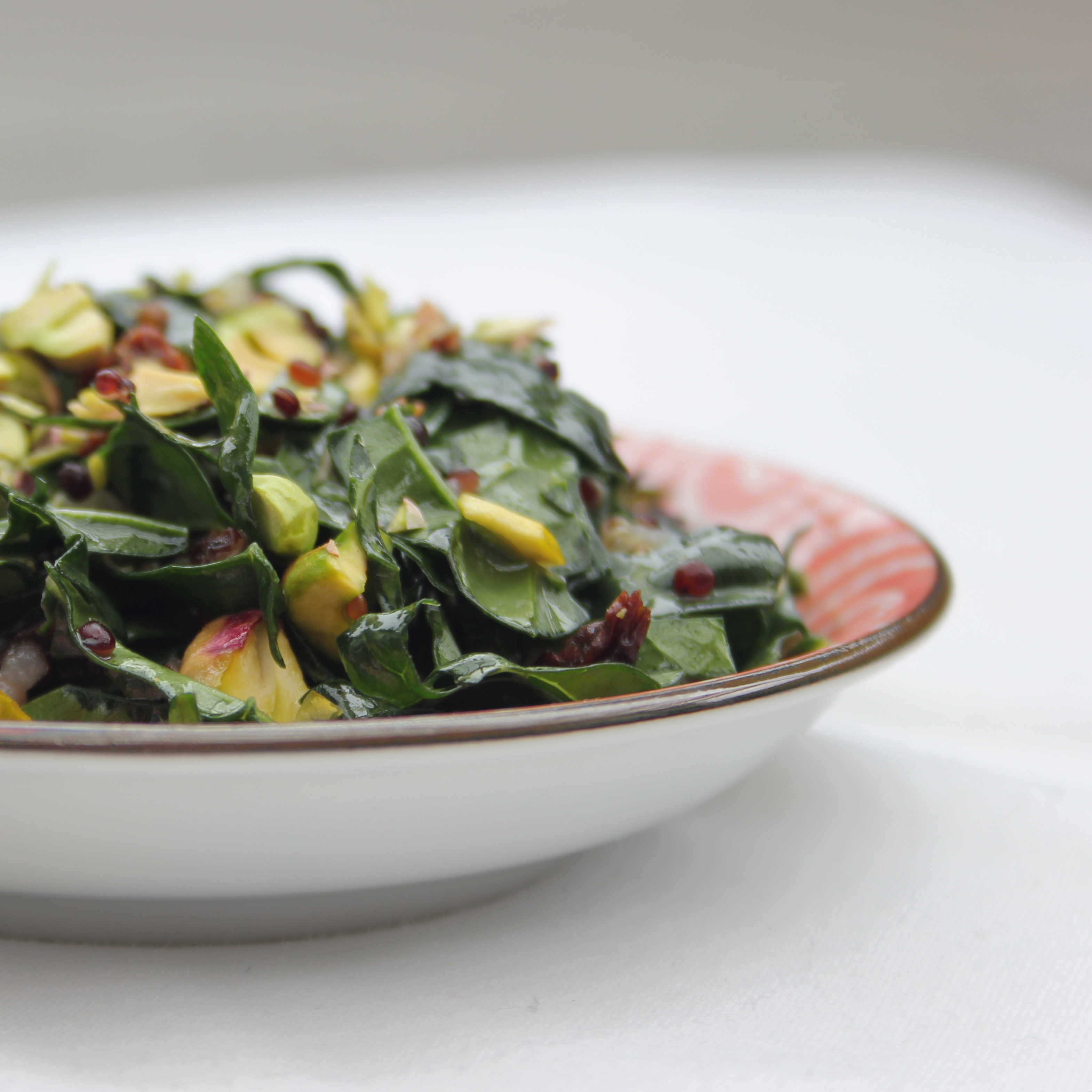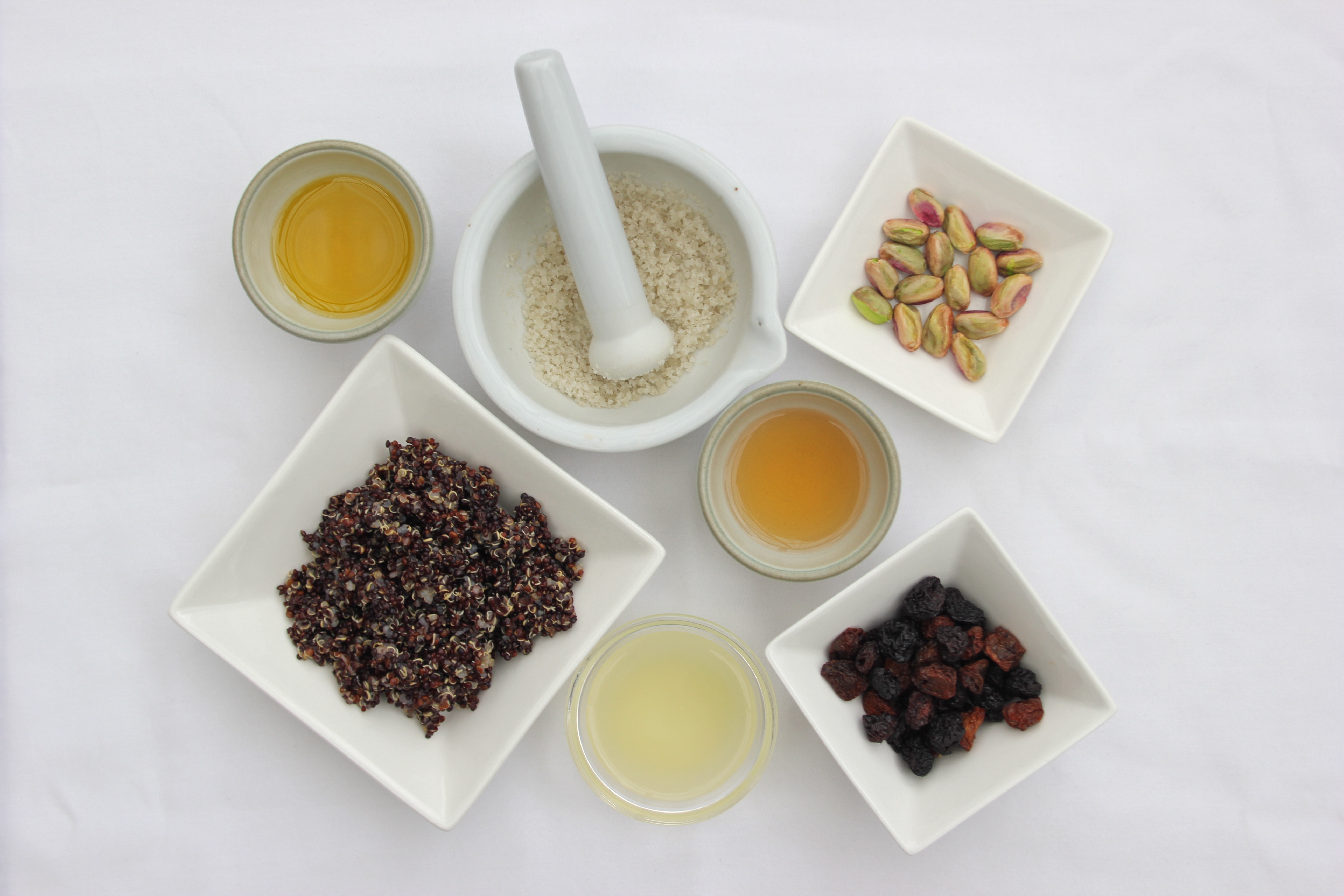 Add quinoa and all but a few chopped pistachios and dried cherries. Toss to combine, arrange in a serving bowl and and sprinkle remaining pistachios and cherries on top.