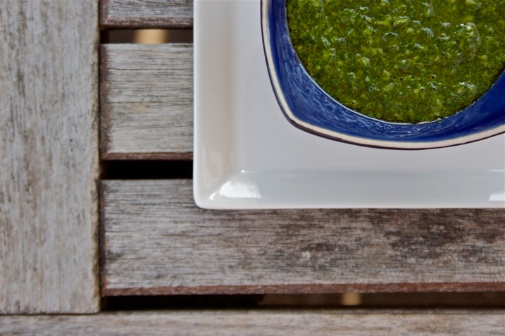 I compiled ingredients, consulted half a dozen recipes and read. Chimichurri is a traditional Argentinian condiment and marinade and it’s supposed to be spicy (one recipe calls for eight cloves of garlic). But I need my food to be flavorful and something that I can finish without downing a quart of water in the process. So I skipped the suggestion to include red pepper and went easy on the vinegar. Some wilty pea shoots needed a hiding place so I snuck those in. After mixing it all together and tasting it, I wondered why chimichurri is relegated to the meat world. I’m sure it’s a divine marinade but it’s also a lot like pesto, just the thing for vegetables and grains. So much so that I ate it twice the day I made it. It’s very good in place of the pesto in this salad, with added cucumber and any extra pearl couscous you have left over.