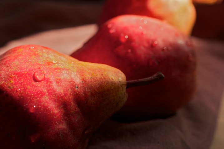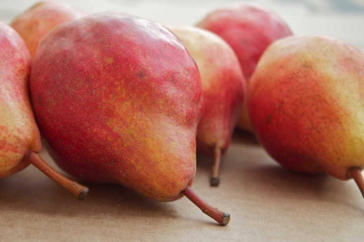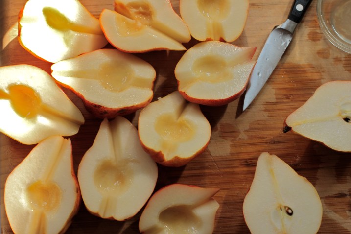 The pears I bought were bruised and a few had holes from being skewered by the stems of other pears, so ripe that the guy at the fruit stand sold them to me for a dollar a pound. Just how they’re supposed to look when they’re ready to be eaten.