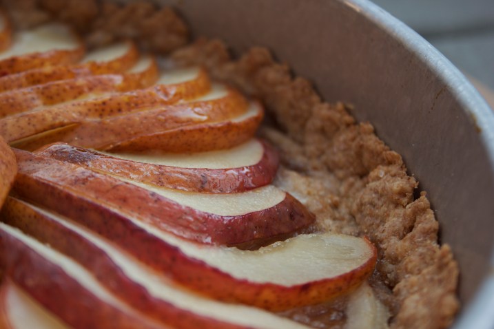Remove crust from the refrigerator. Place pear halves cut-side-down and slice lengthwise into ¼-inch slices. Arrange on top of the crust however you’d like and rub exposed surfaces with lemon juice. Mix one tablespoon of the maple syrup with remaining lemon juice and brush over the surface of the pears. Cut remaining tablespoon of butter into small cubes and use to dot the top of the tart.