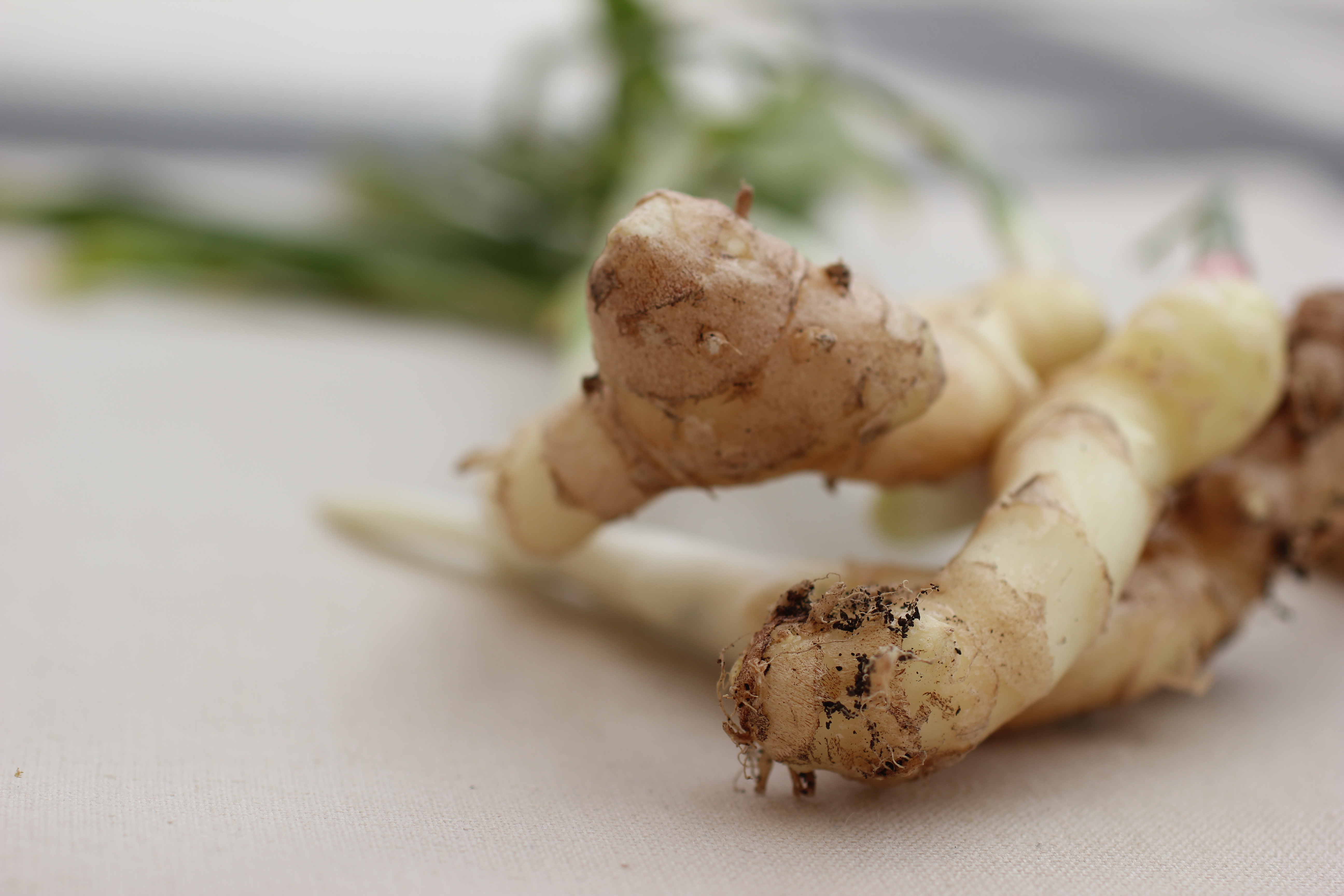 Meet baby ginger. These weren’t pulled from a box that arrived from Kerala. They were grown somewhere in Washington. I found them sitting unceremoniously on a wooden table, the edges of the leaves just starting to brown. What luck! To find the immature version of the rhizome that usually travels halfway around the world before it lands in a curry or a mug of medicinal tea.