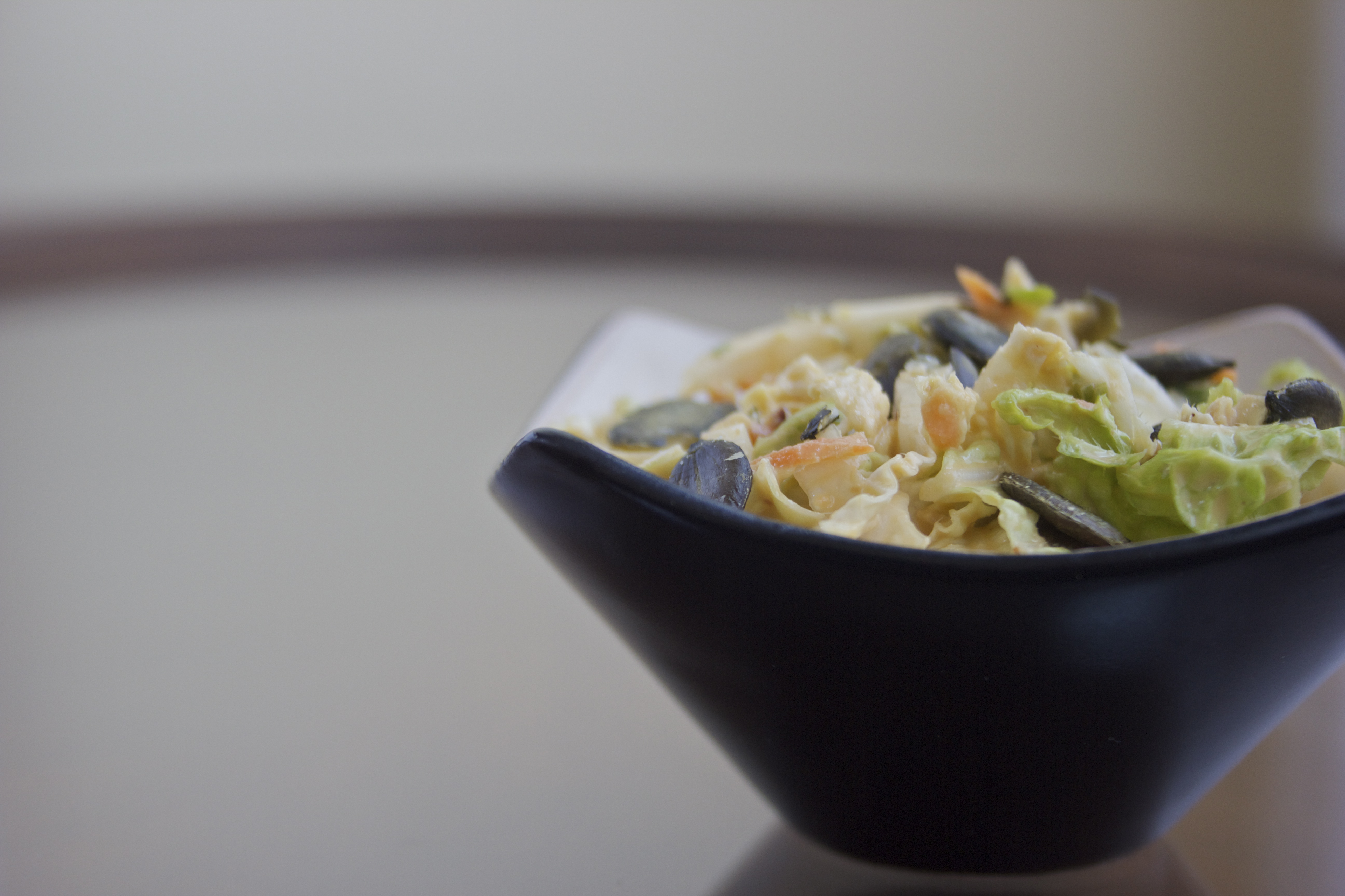 Add the dressing and toss together with a sturdy wooden spoon until all of the vegetables are well coated. Taste and season with salt. If the slaw doesn’t yet highlight the ginger, mince more ginger, add and continue tasting until it does. Toast the pumpkin seeds, crush slightly and sprinkle over the top of the slaw.