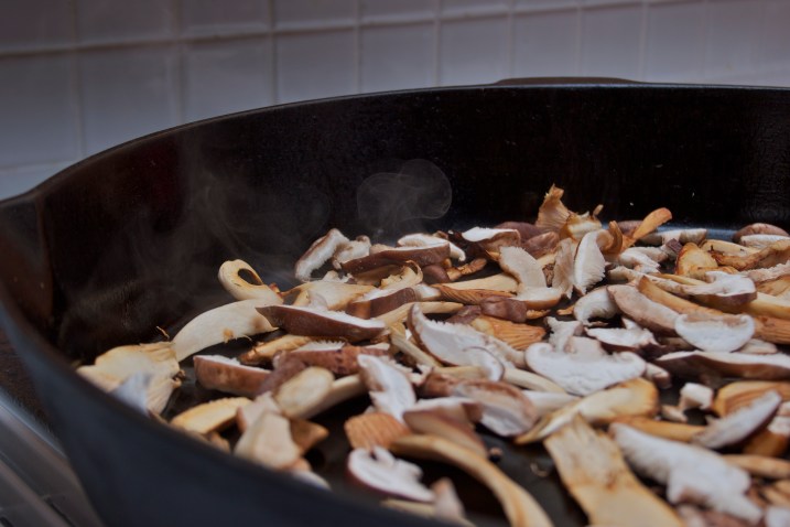 Place mushrooms in the dry pan and cook, tossing or stirring on occasion to avoid burning them, until slightly browned and fragrant.