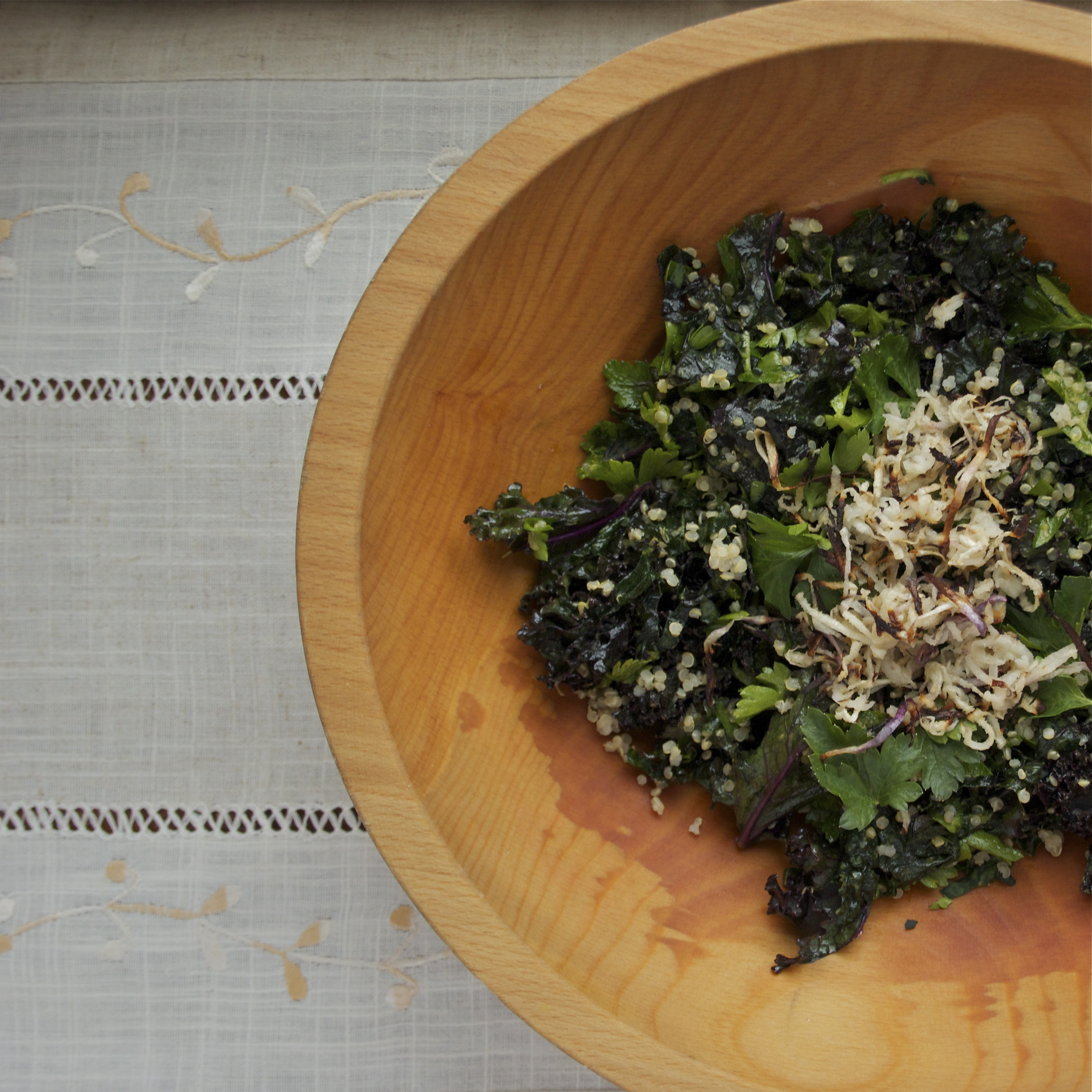 Add chopped parsley and most of the quinoa to the kale leaves and mix to combine. Dress the salad and toss to coat; the hearty leaves can handle a lot of dressing. Top with the extra quinoa, whole parsley leaves and roasted turnip strips.