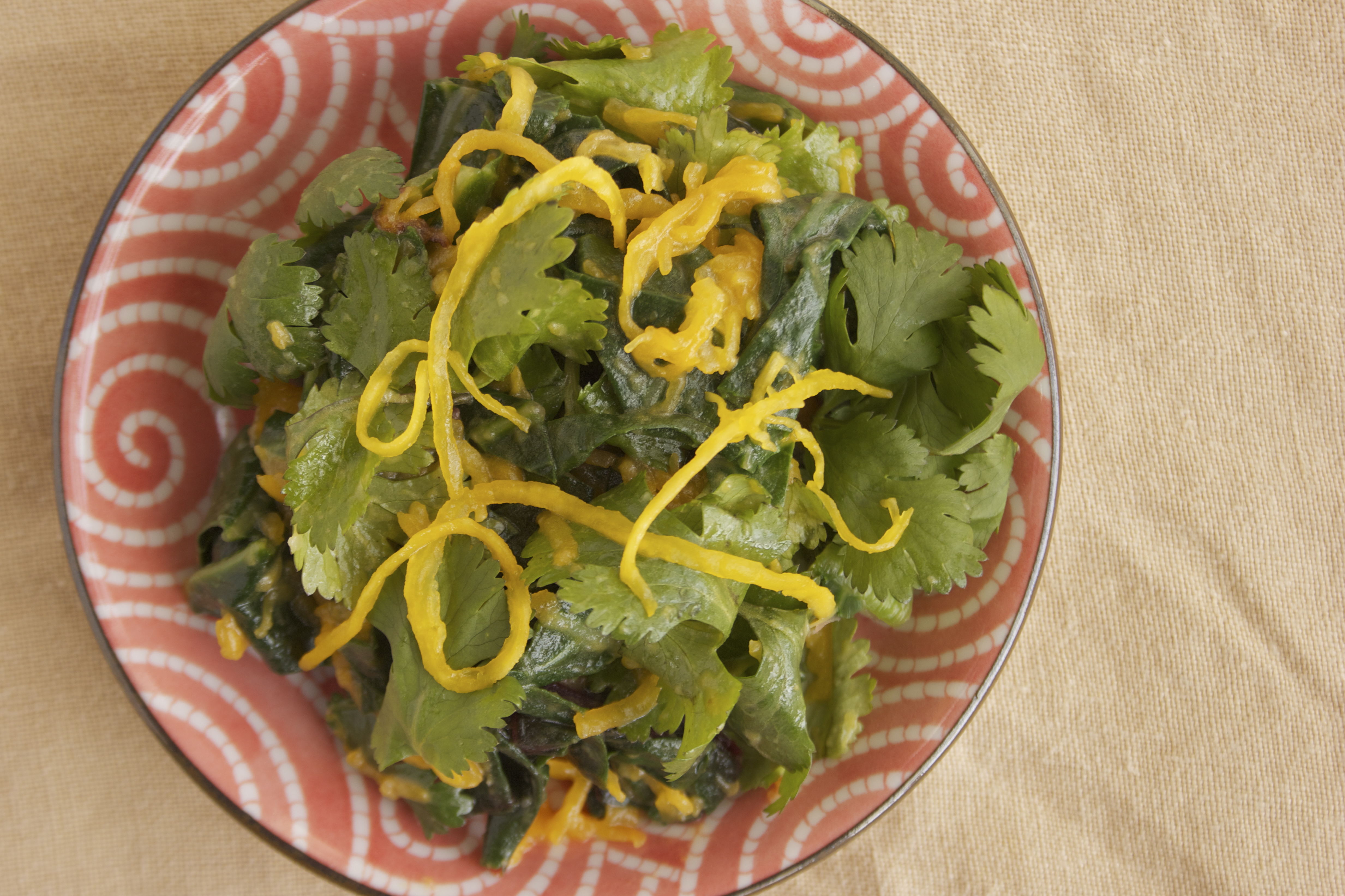 Mix gently into the bowl with the cilantro and collards. You may opt not to use all the squash. Pour the vinaigrette over the top and toss together until everything is coated. Taste and adjust for salt.