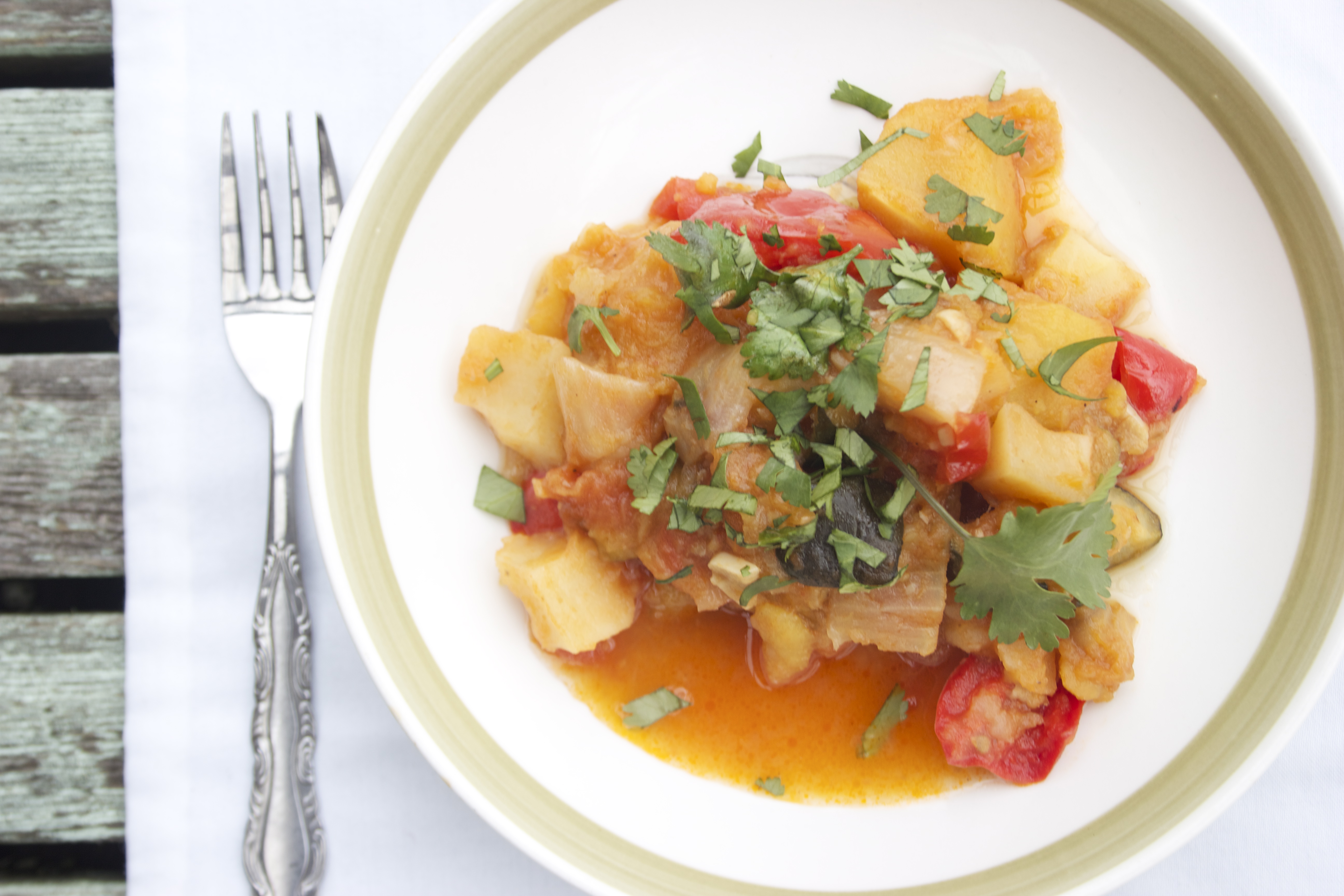 Tomatoes, eggplant, red peppers. Yep. I used these and a load of other ingredients to make the bright ratatouille from Plenty. And since the recipe includes parsnips, I was able to nudge in something local – there are still some kicking about from Kirsop Farm.