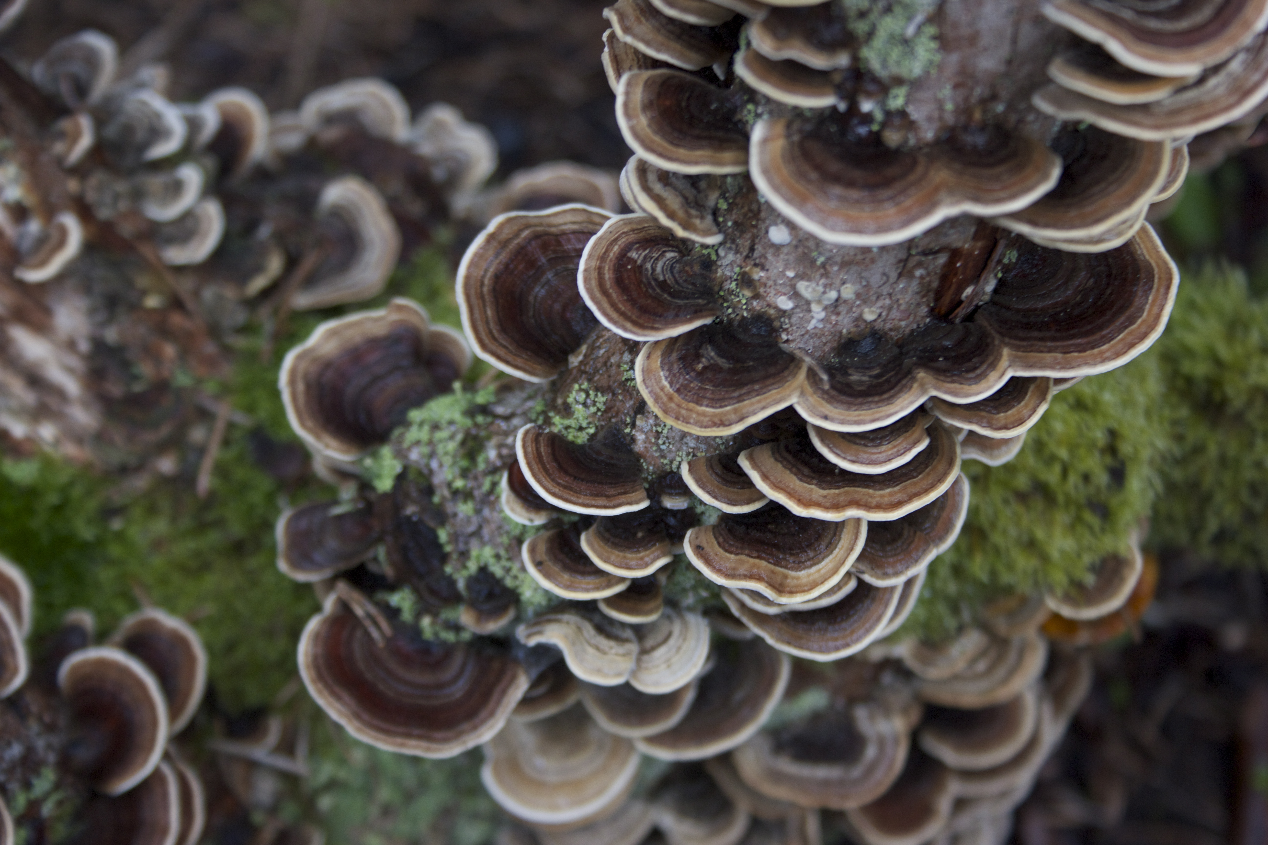 This idea, a visual experience of simultaneous action, came back to me when I saw the remains of one of our rhododendron bushes, a victim of severe pruning, on my way home from a walk. I’d never seen that shelf lichen before. The white rings were glowing in the mid-morning light, the same light I try to catch on the back deck when I’m photographing food.