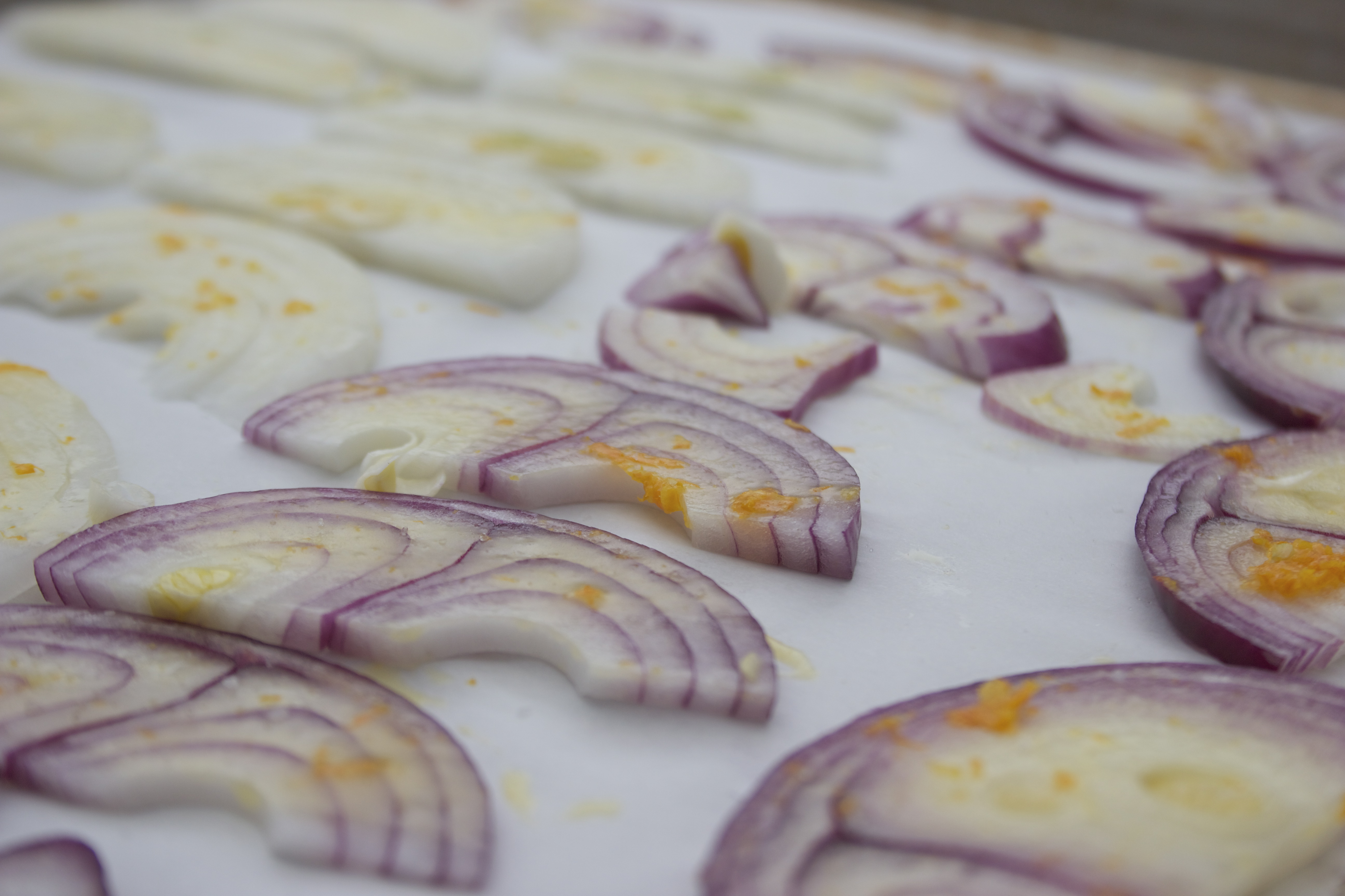 Then I combined olive oil, melted coconut oil, a touch of apple cider vinegar and some orange zest in a small bowl and brushed it lightly on onion slices.