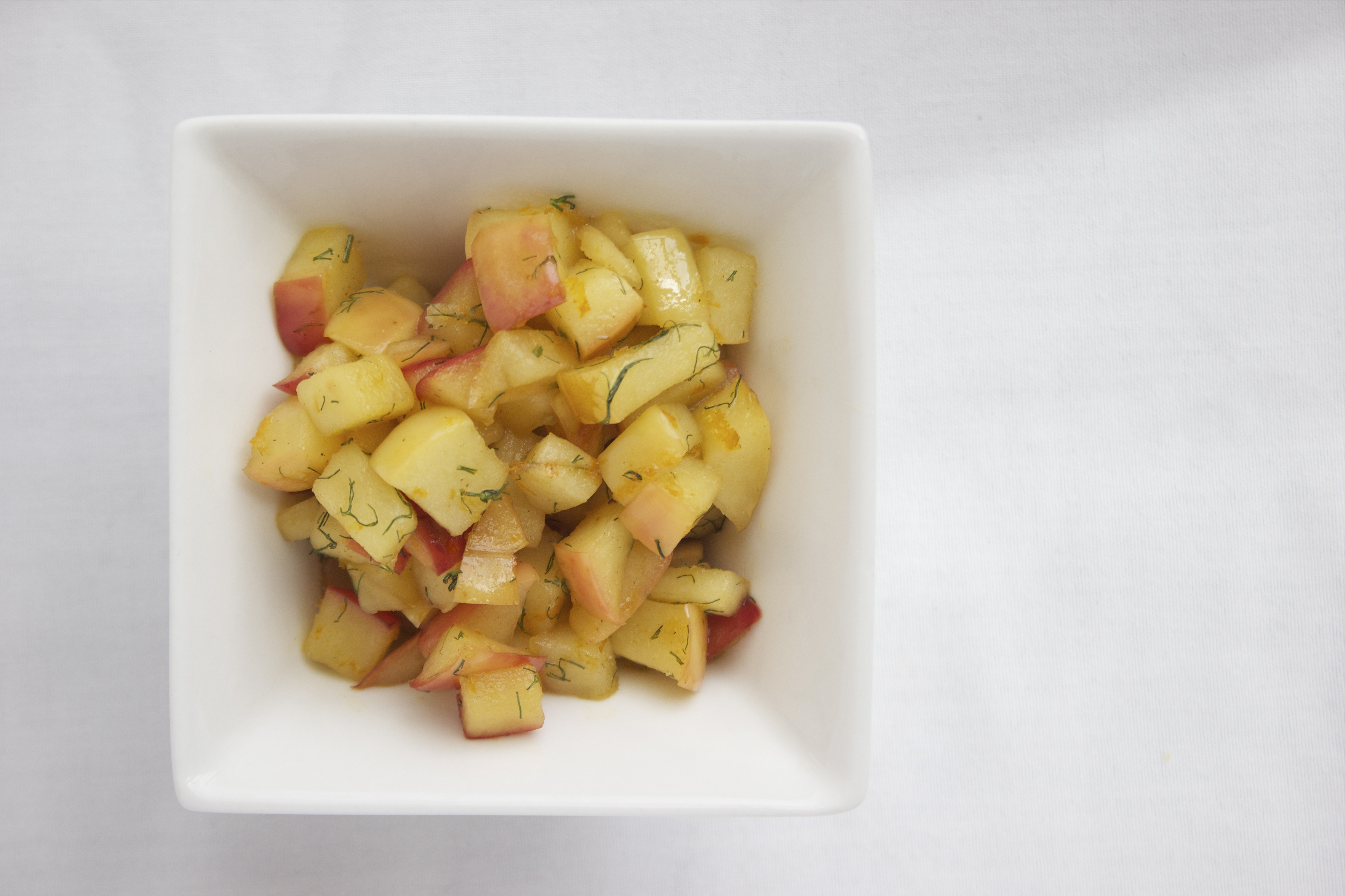 Yesterday I diced and cooked up one of the apples, flavoring it with things I had around, notably some fennel fronds that would usually go the way of used coffee grounds and avocado pits. The apple flesh, white when I cut into it, cooked into yellow cubes that kept their shape in the pan.