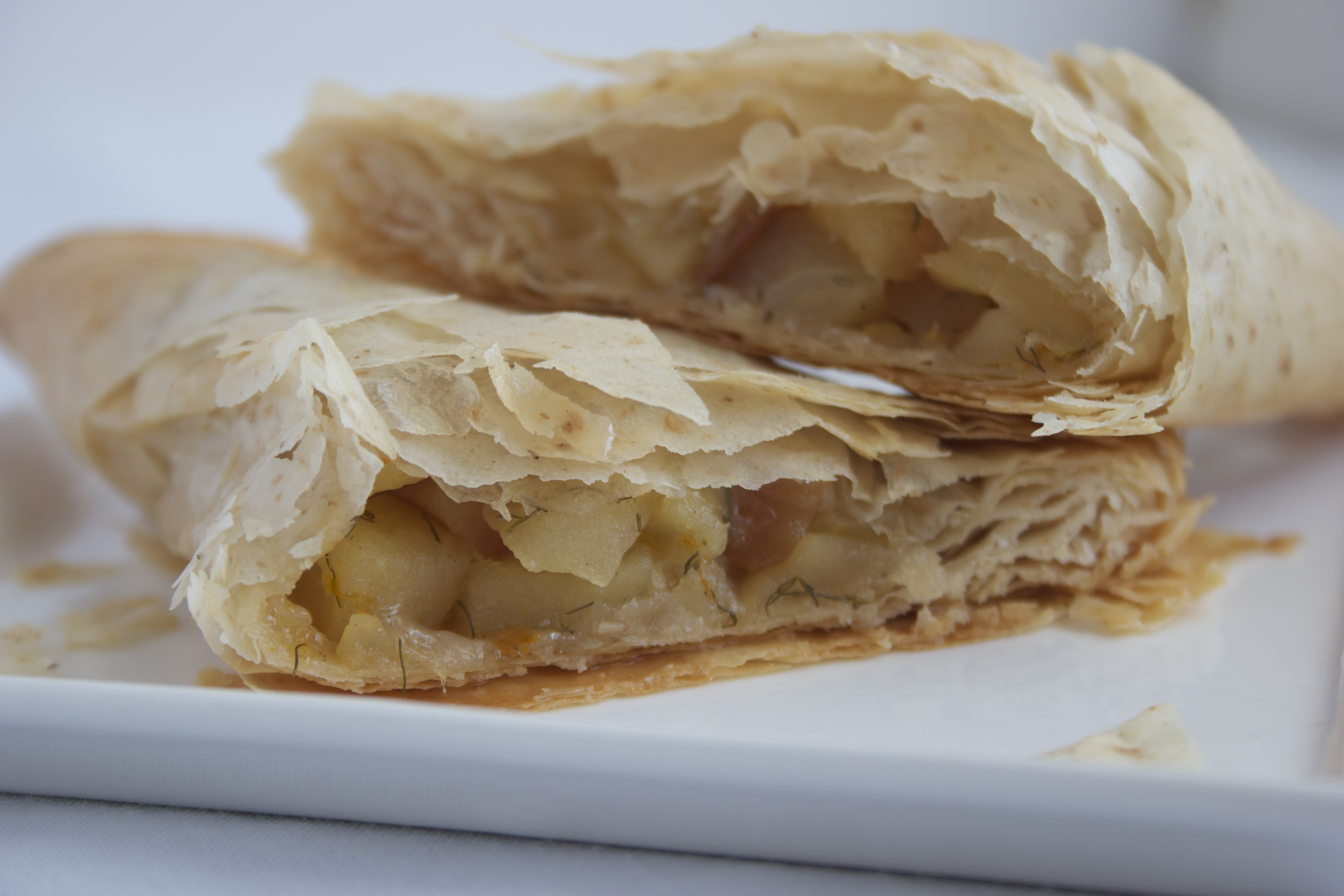 As I nudged and prodded the layers of dough apart, I saw that I hadn’t, in fact, worked with fillo in the past. I’ve eaten Middle Eastern pastries, perhaps enough that I tricked myself into thinking I was familiar with the stuff. Despite a raggedy first go, it wasn’t so bad though, due to fillo’s nature as a forgiving medium. They were not only tasty but pretty on the plate.