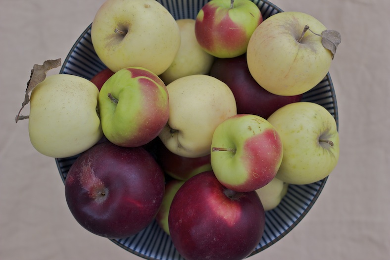 Earlier today I chopped up some of the small apples I collected this week. From the market, tiny Lady apples and a thin-skinned golden saucing variety; from the co-op, dark red Arkansas Blacks. The latter are tart and good for baking, though the flesh goes brown quickly. I was glad I juiced the lemon first so I could toss them with it as they were sliced.