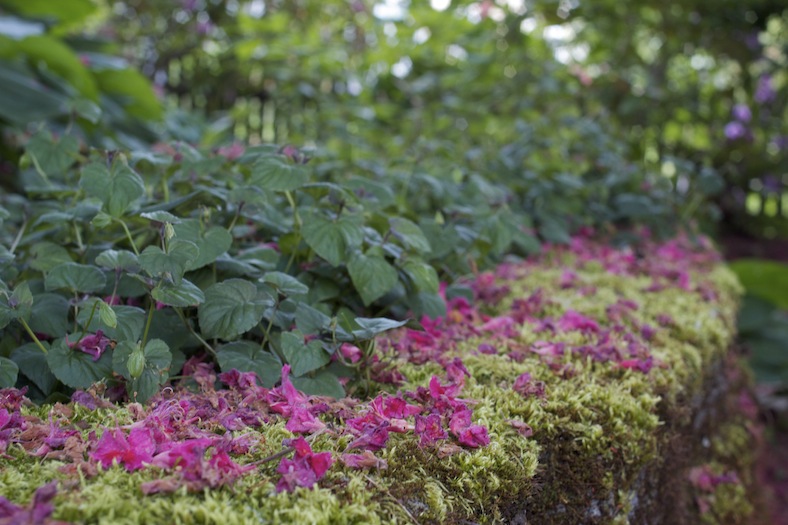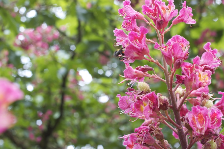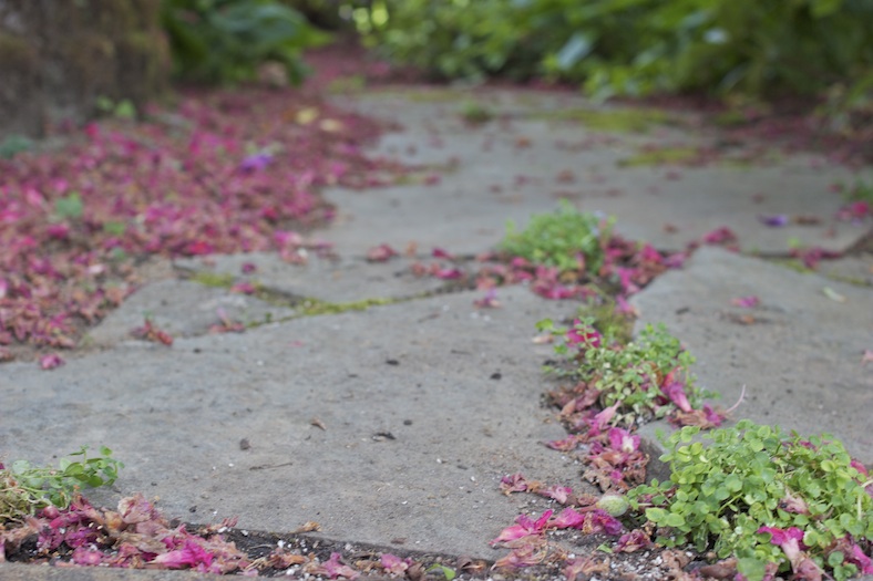 A note on the photos: Our yard is blanketed in pink. Pink blooms serve as mulch around stones on the short path beneath the horse chestnut. Stand on it, next to the pink rhododendron, and the buzz of bumblebees is so loud, you can feel it.