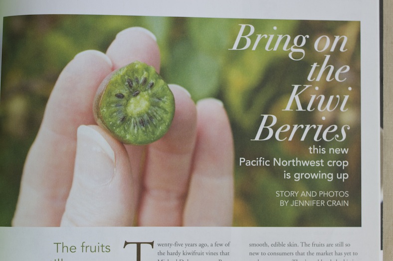 I’m thrilled to have two articles in this issue, including my first feature for the magazine. I pitched the story for kiwi berries—and took the photos—a full year ago. I first ran across the miniature kiwifruits at our food co-op, packaged in half-pint clamshell containers. When I learned that I could buy them directly from the grower, Burnt Ridge Nursery, I went down to the farmers’ market and asked about them. Michael Dolan told me they grow like crazy in the Northwest, something I didn’t know (you mean, they’re not tropical?). Bonus: my hand makes its first magazine appearance!