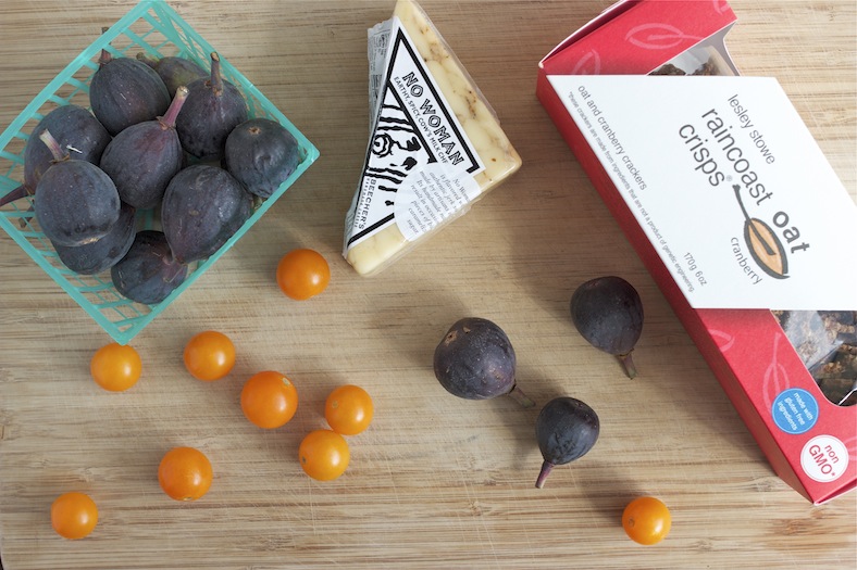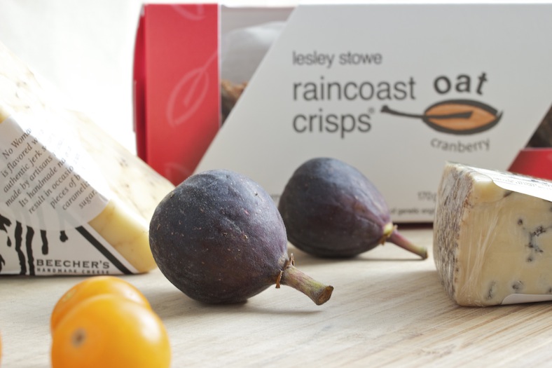 Pictured: Rosemary Raisin Pecan Raincoast Crisps, Napa Valley olive oil, shelled pistachios, Rogue Creamery’s Caveman Blue, Cranberry and Hazelnut Raincoast Crisps, fresh figs, Sungold tomatoes, Beecher’s No Woman cheese, rum-soaked dried cherries.